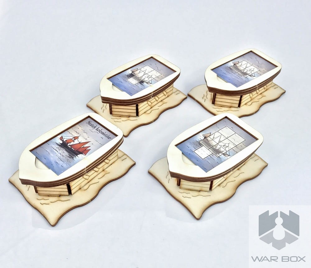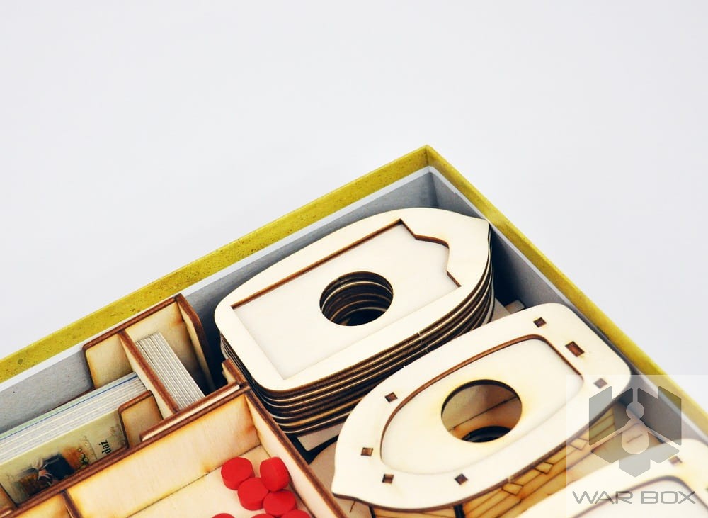 Conversion kit for Puerto Rico game organizer, allowing you to store the 1st edition in it. The content is 4 overlays on ships, which can be used for both versions of the game. Elements are placed in the corner of the insert, which is shown in one of the photos.