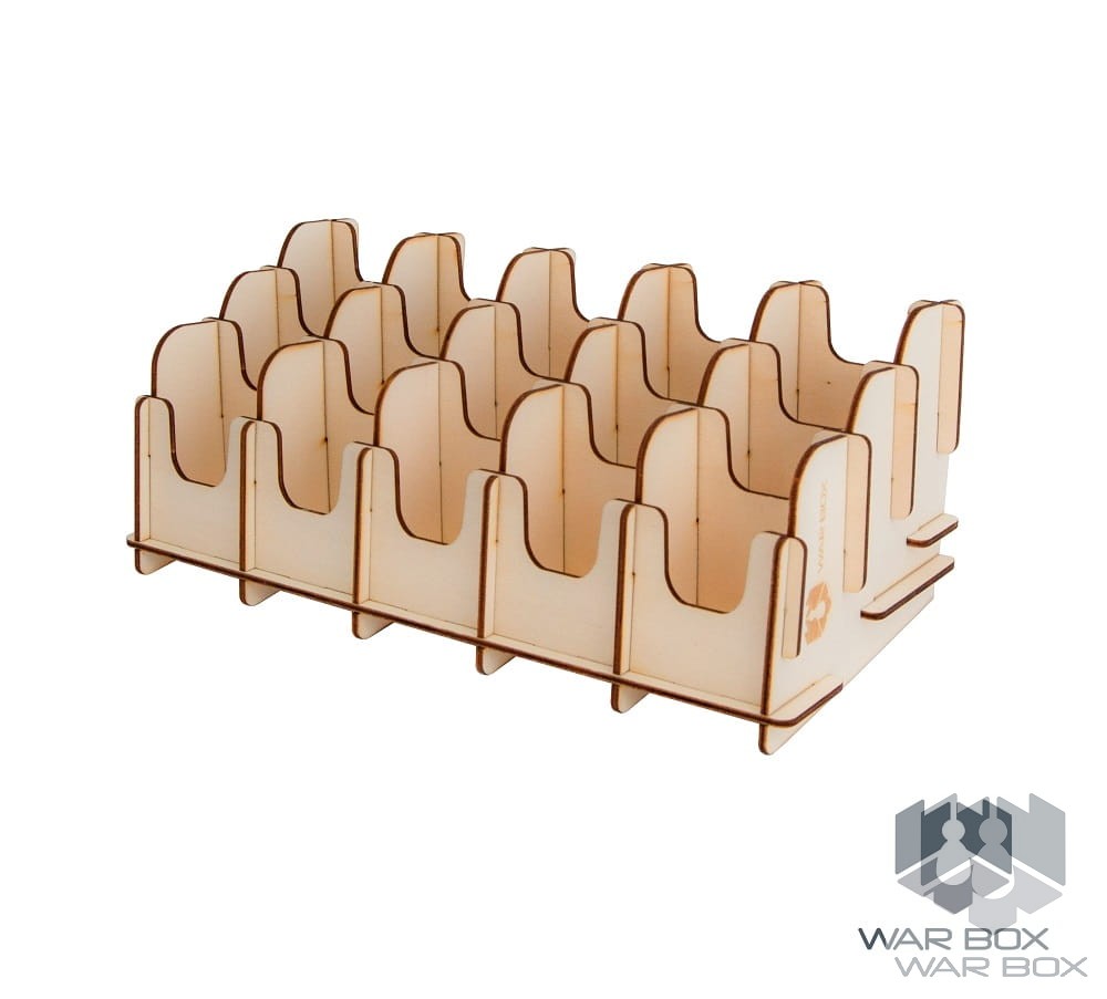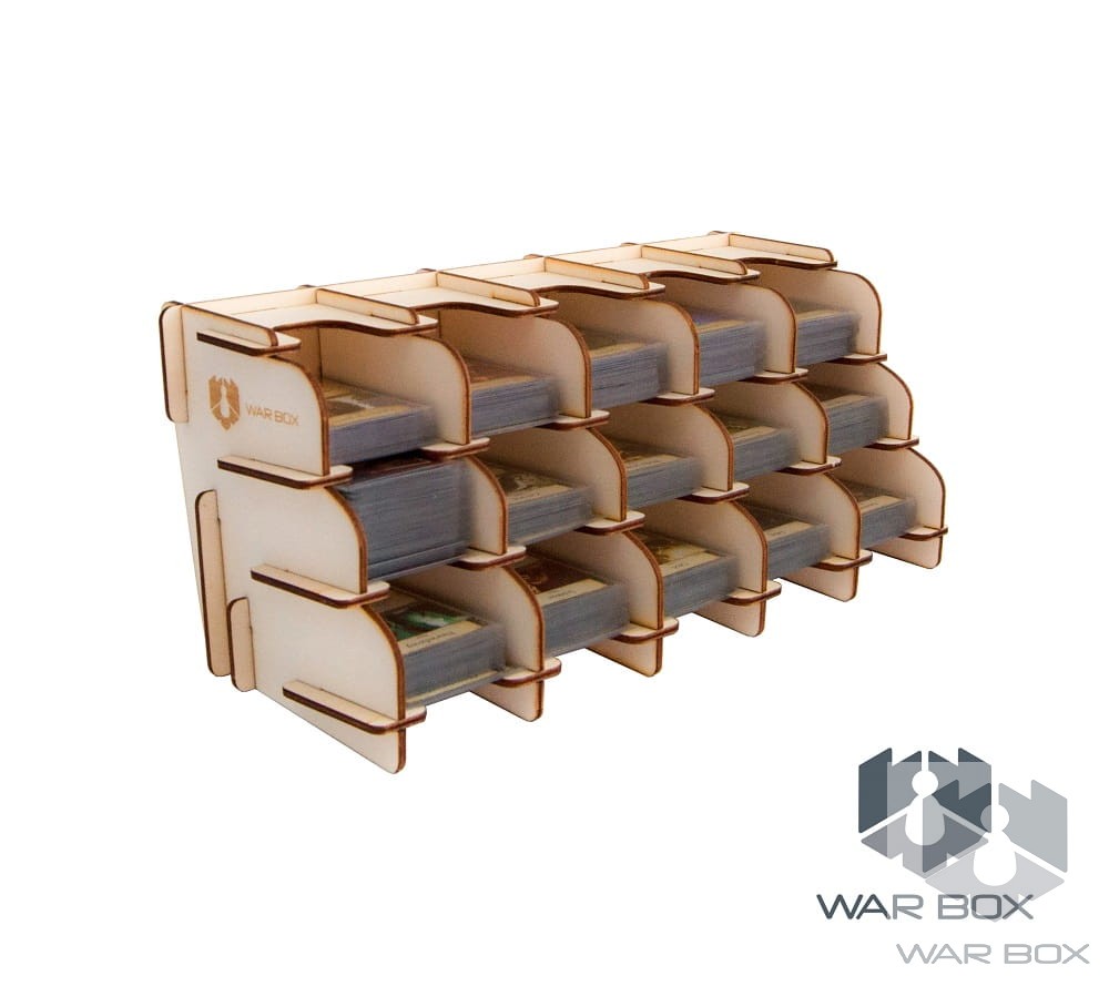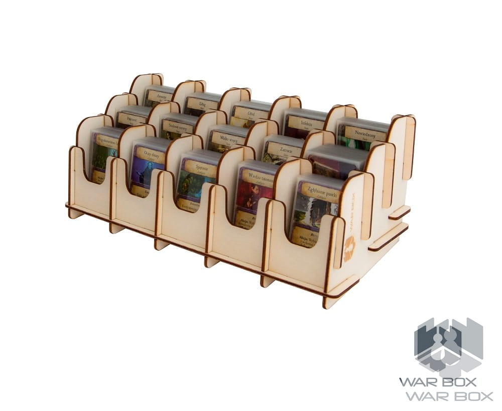 Dual-sided 15-deck card holder suitable for Mini American (41x63 mm) and Mini European (44x68 mm) cards. The product can be used both vertically and horizontally as seen in the above pictures. The bottom of the card holder has been placed at the right angle to prevent the pile of cards from falling apart during the game. One card compartment holds about 100 cards without sleeves, 75 cards with thin sleeves (about 50 microns), or 55 cards with thick sleeves (about 90 microns).