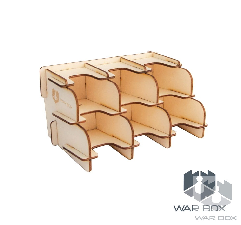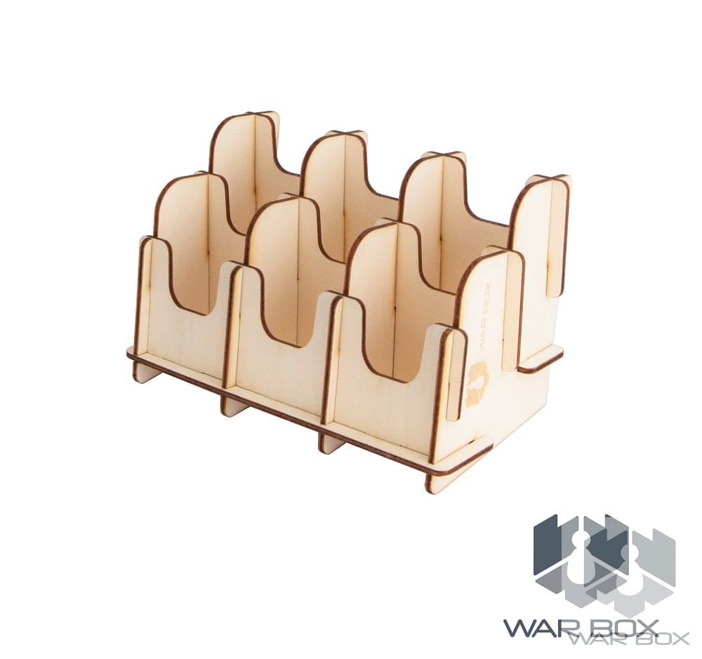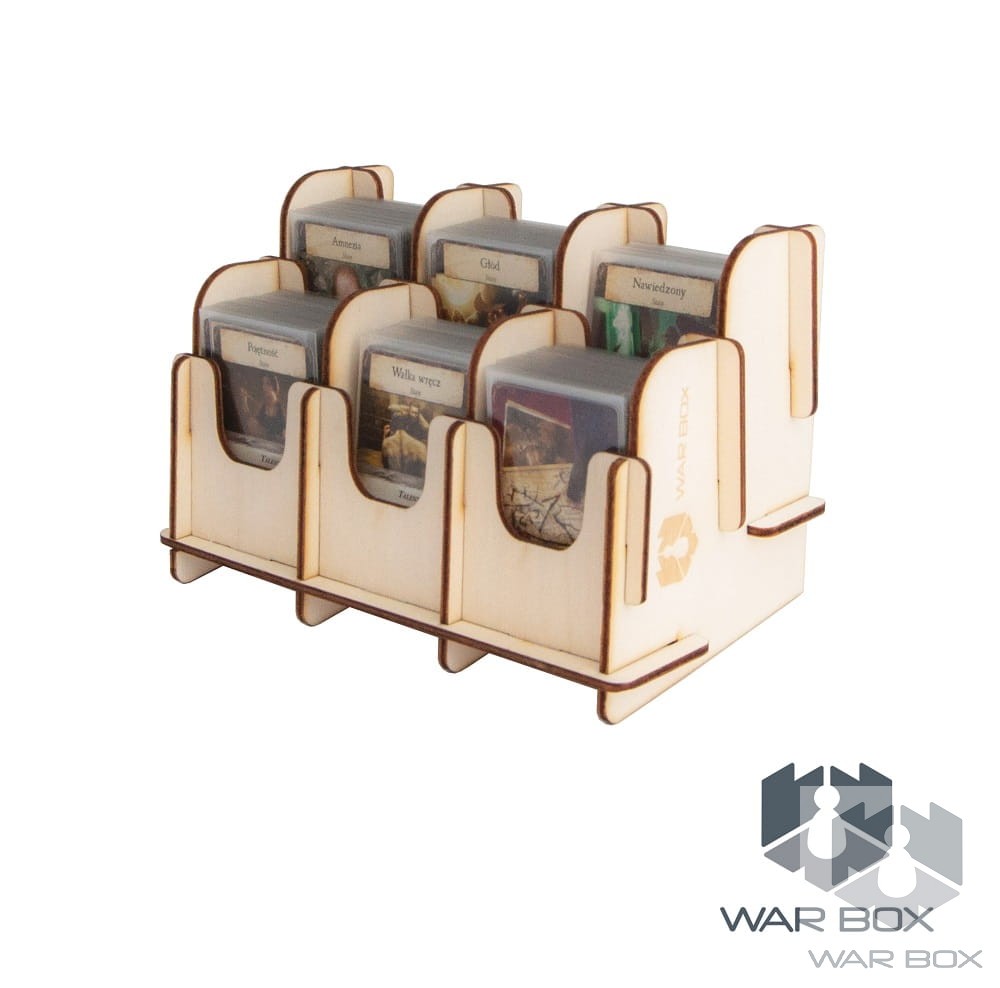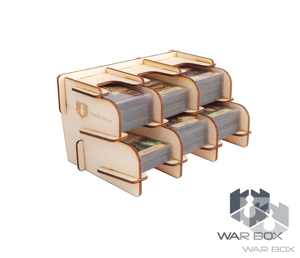 Dual-sided 6-deck card holder suitable for Mini American (41x63 mm) and Mini European (44x68 mm) cards. The product can be used both vertically and horizontally as seen in the above pictures. The bottom of the card holder has been placed at the right angle to prevent the pile of cards from falling apart during the game. One card compartment holds about 100 cards without sleeves, 75 cards with thin sleeves (about 50 microns), or 55 cards with thick sleeves (about 90 microns).