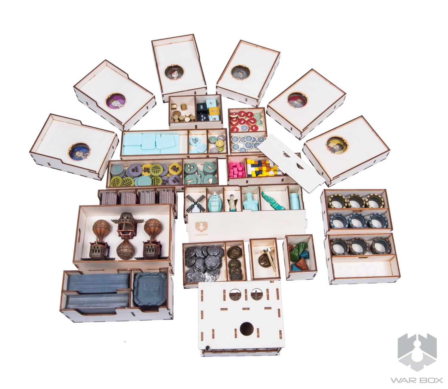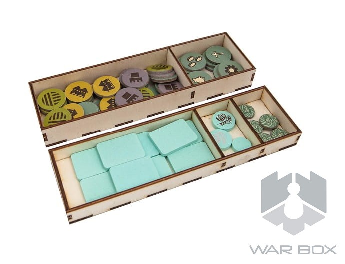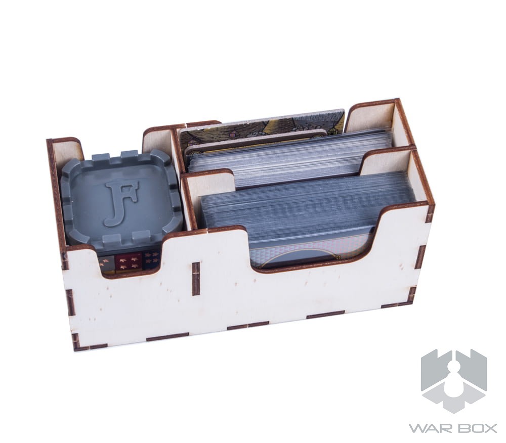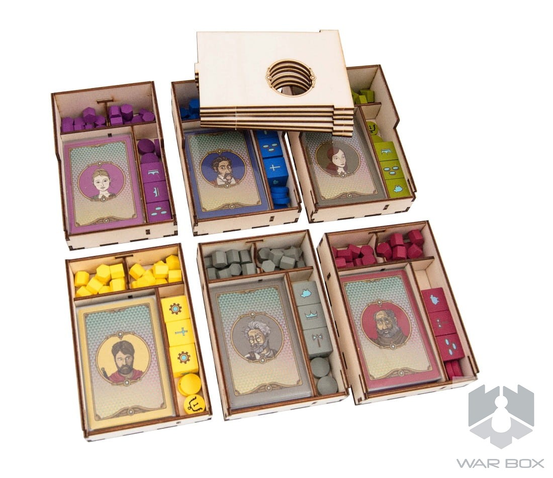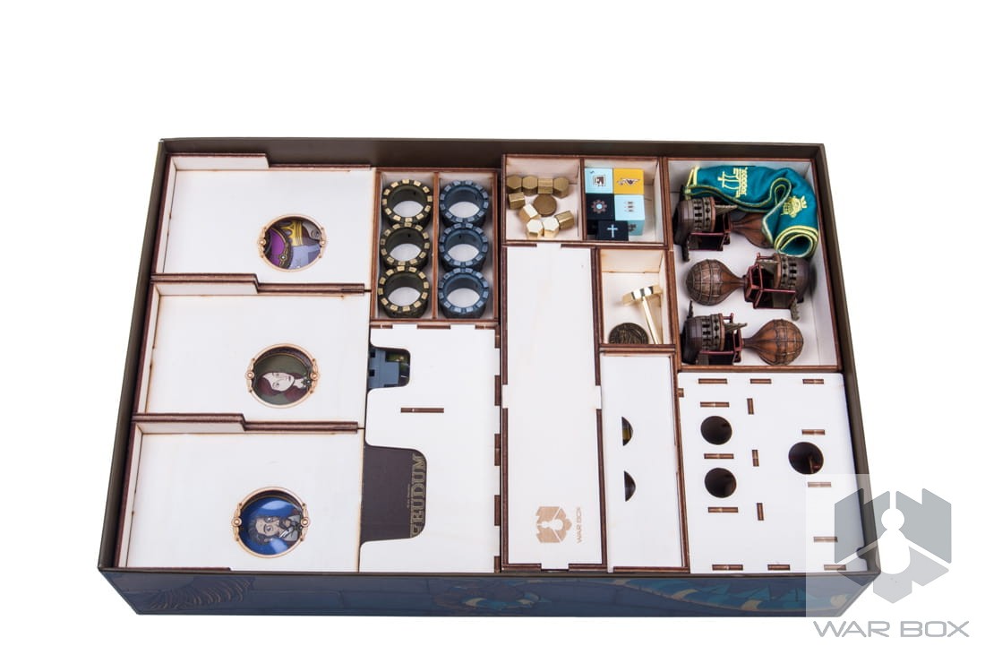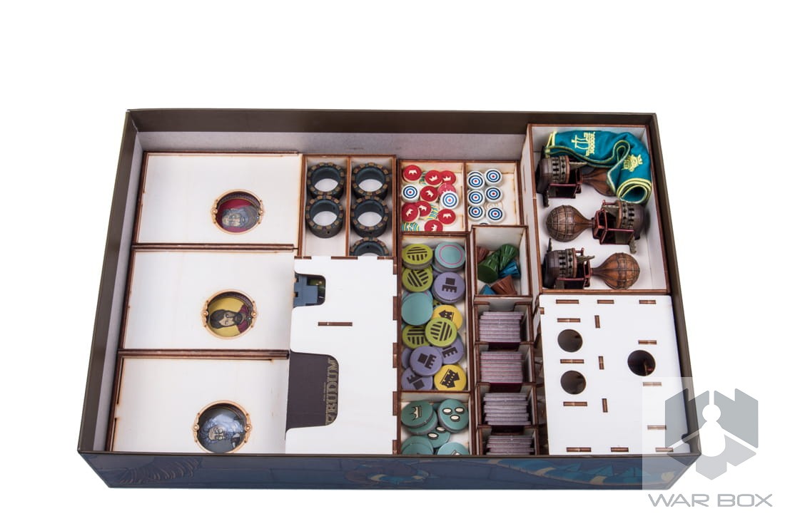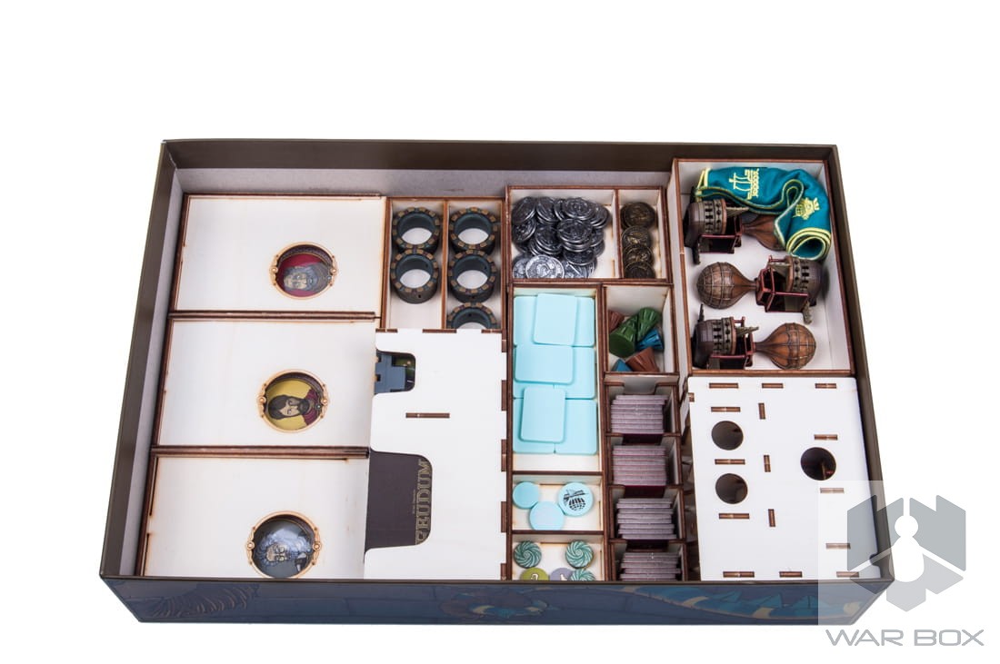 The wooden insert designed for Feudum. The organizer will accommodate the core game and expansions such as : Squirrels & Conifers, Alter Ego, Seals & Sirens, The Queen's Army, Windmills & Catapults, Rudders & Ramparts x3, Resin Windmill, Guild Tracking Dice, Metal Airship Flight Stand x3, Deluxe Metal Royal Guards, Deluxe Wooden Pieces (29 szt), Flying Epoch Marker in Foil, Royal Starting Player Marker, Embroidered Haversack, Foil-Stamped Wooden Vessels (9 of them), Gilded Progress Die, and promo cards.