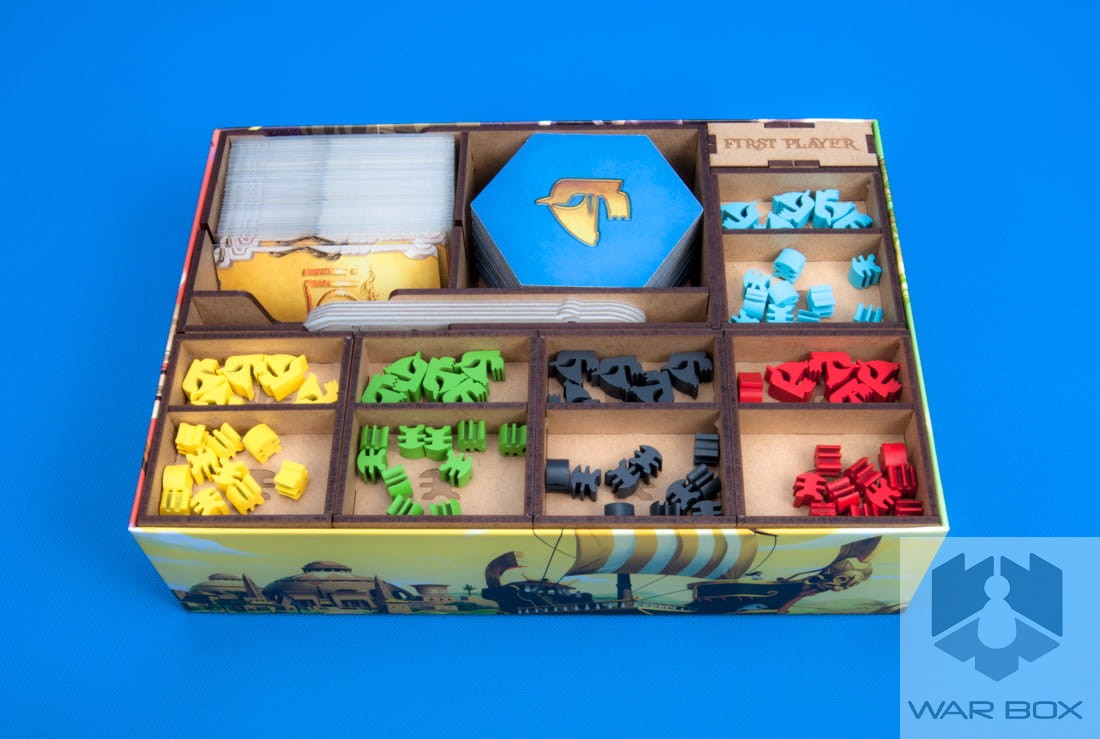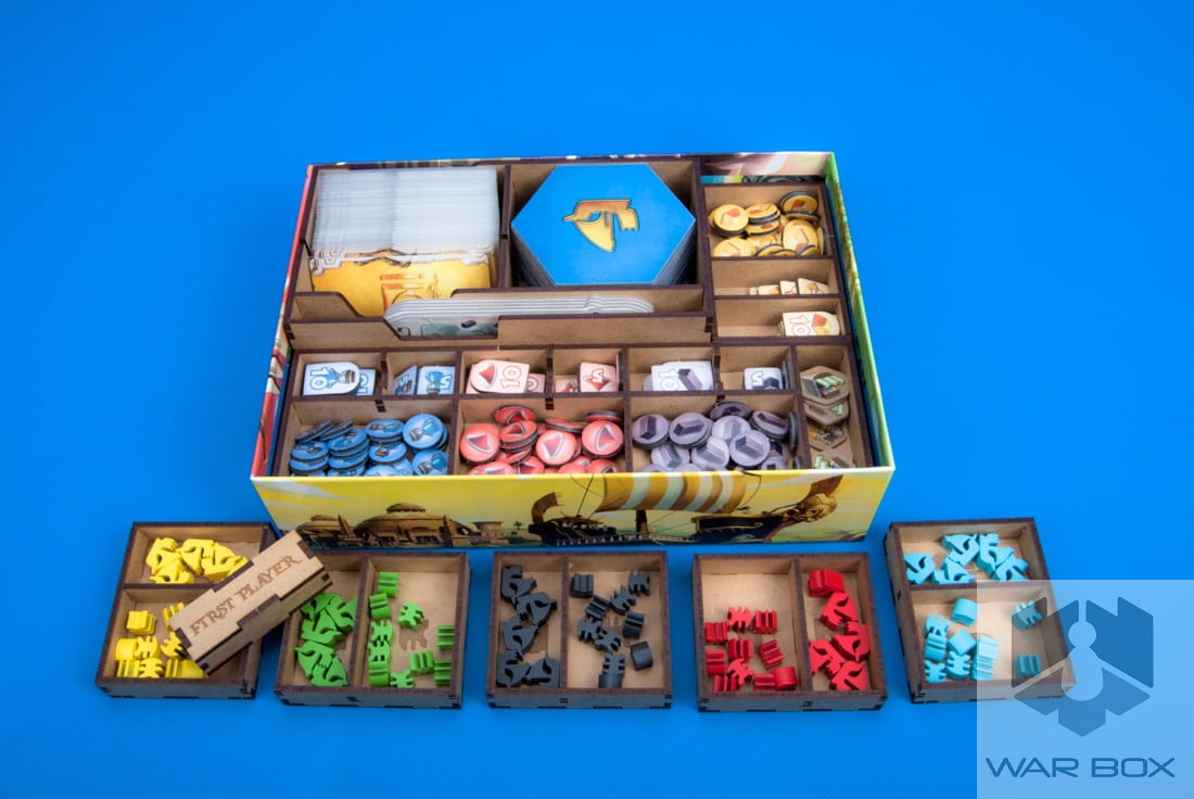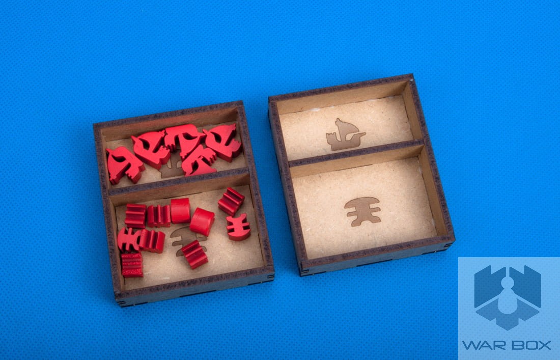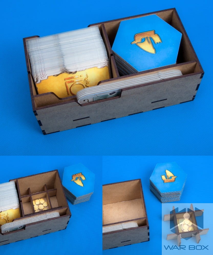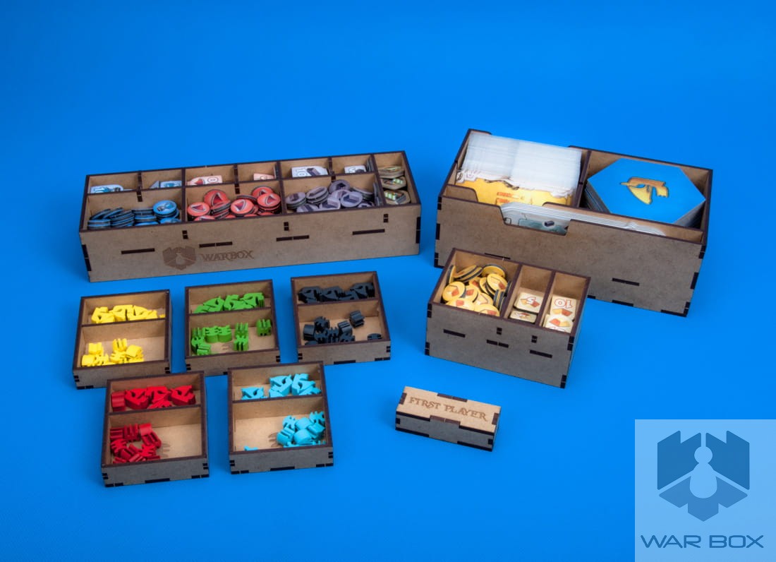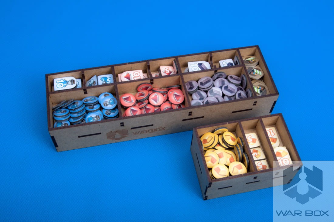 - 1 storage box for cards, terrain hexes and player production tiles