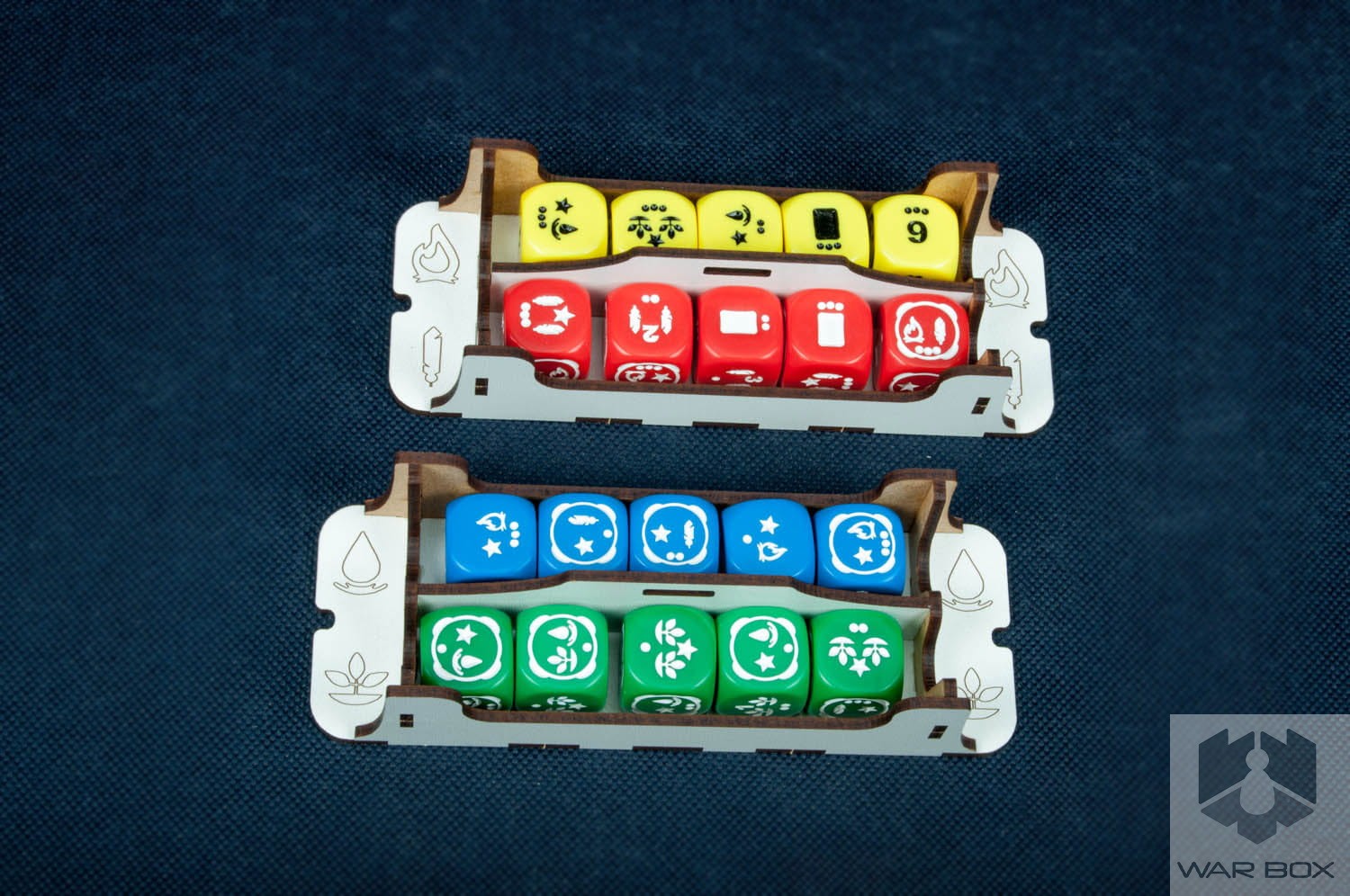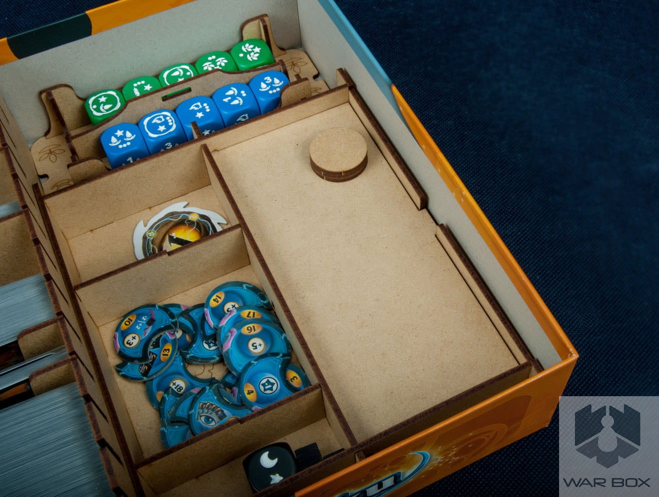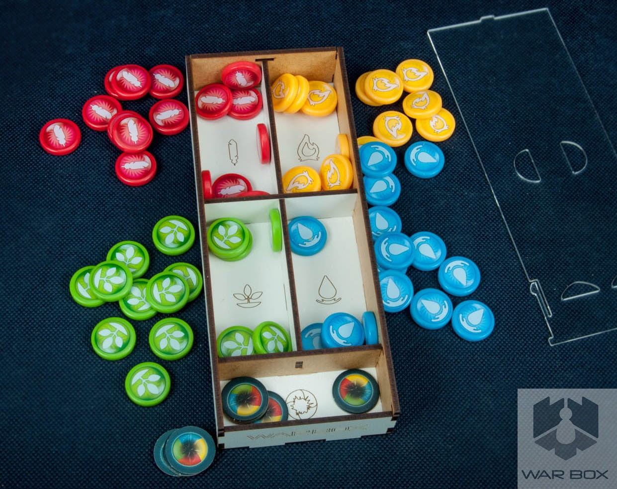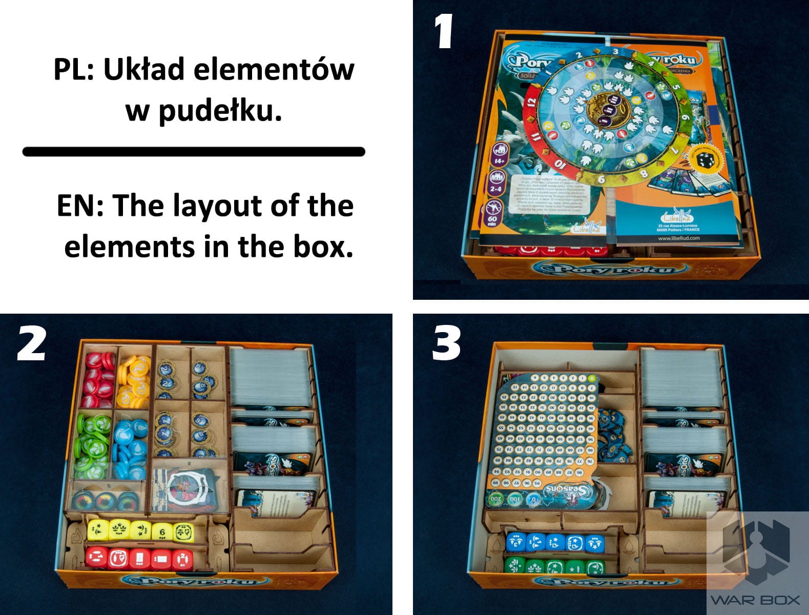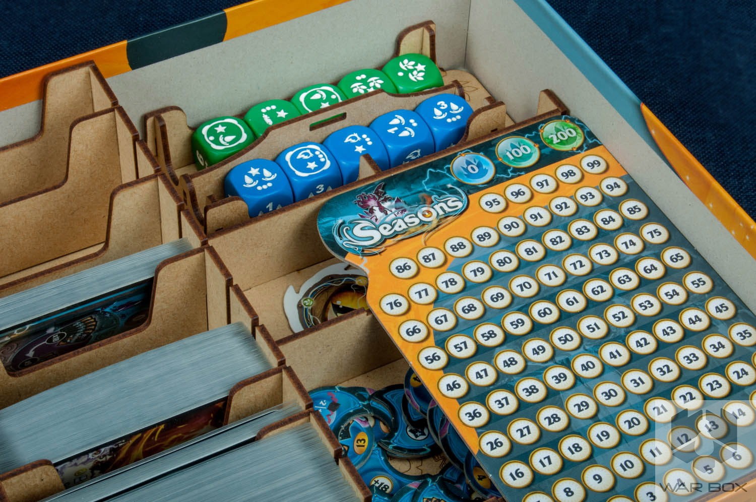 We present the second edition of the insert compatible with the Seasons game. The product has been redesigned from scratch, using the latest knowledge and technology from WarBox. Beautifully engraved, the insert will speed up gameplay in this excellent and colorful game. Containers with closable lids will protect the components from spilling during transport.