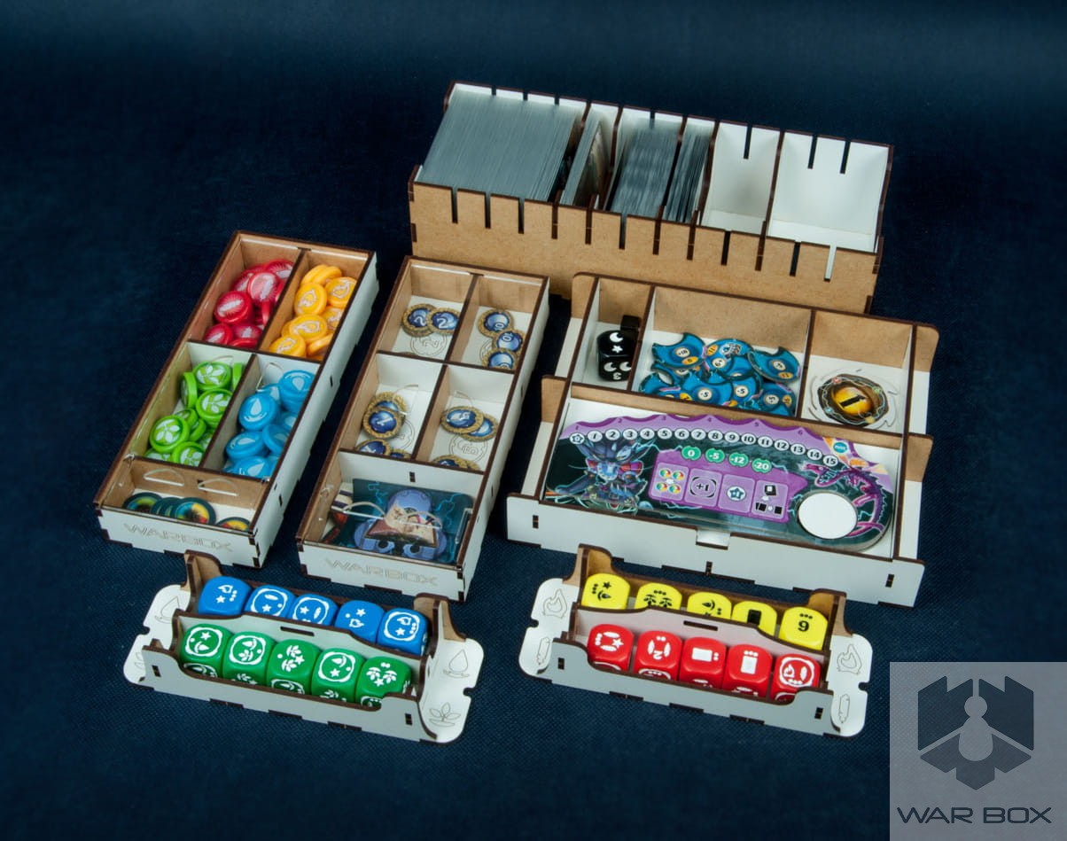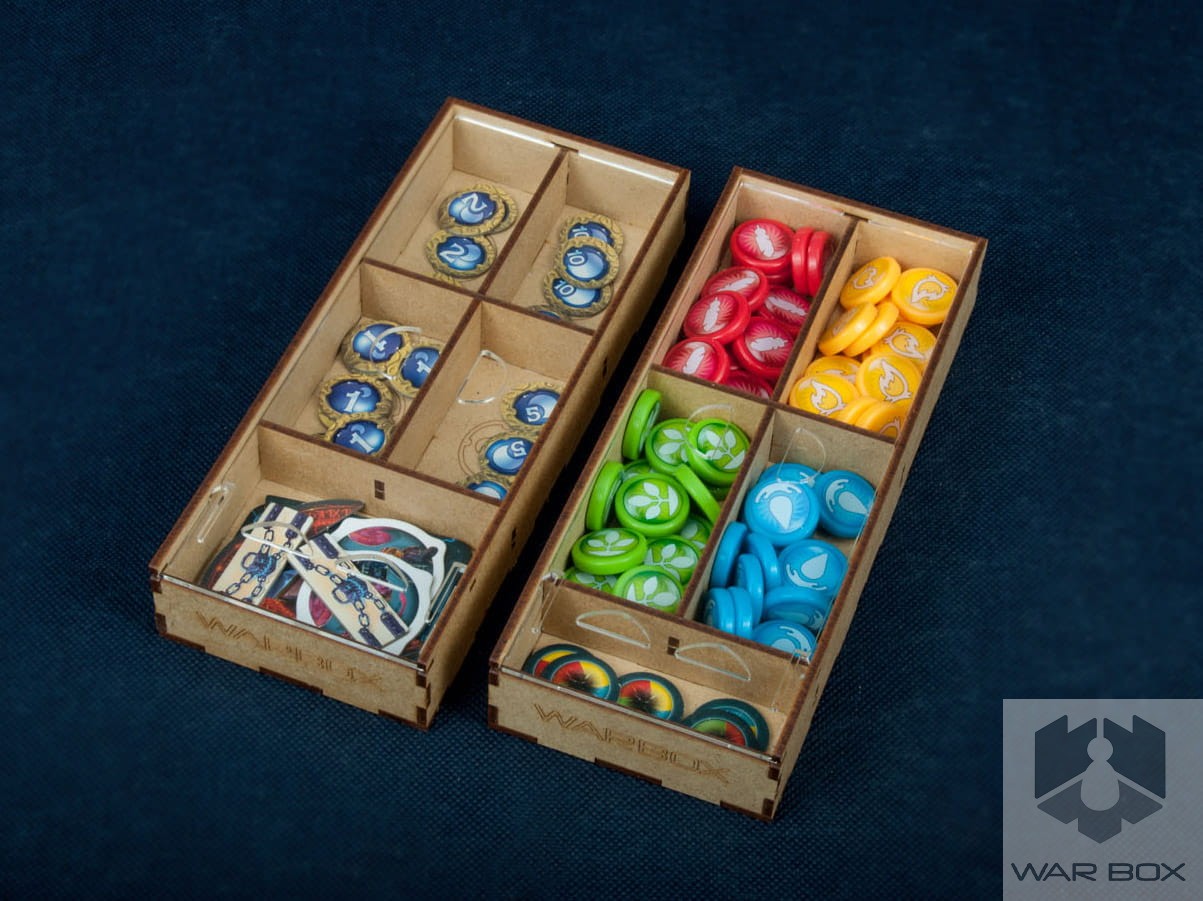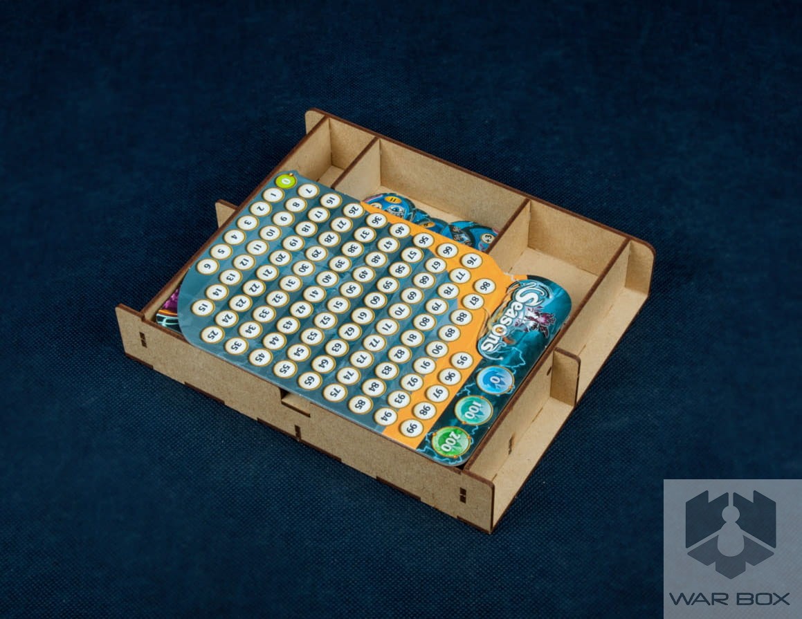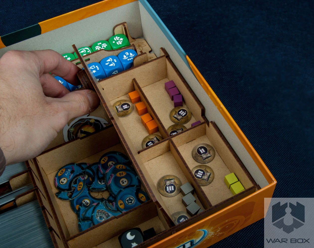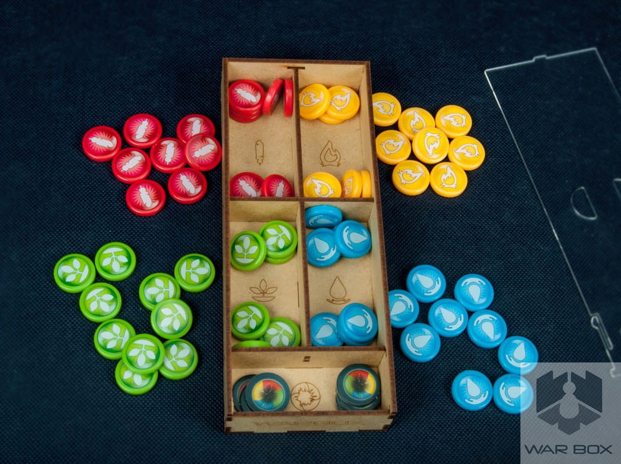 We present the second edition of the insert compatible with the Seasons game. The product has been redesigned from scratch, using the latest knowledge and technology from WarBox. Beautifully engraved, the insert will speed up gameplay in this excellent and colorful game. Containers with closable lids will protect the components from spilling during transport.