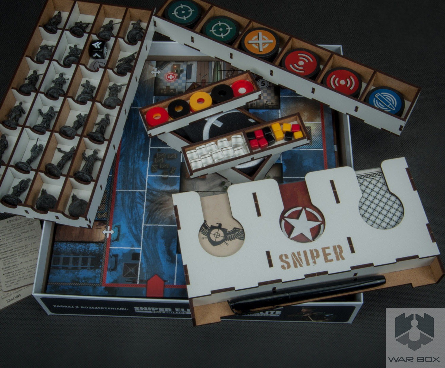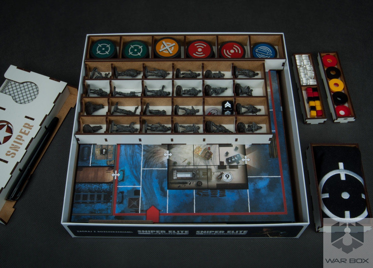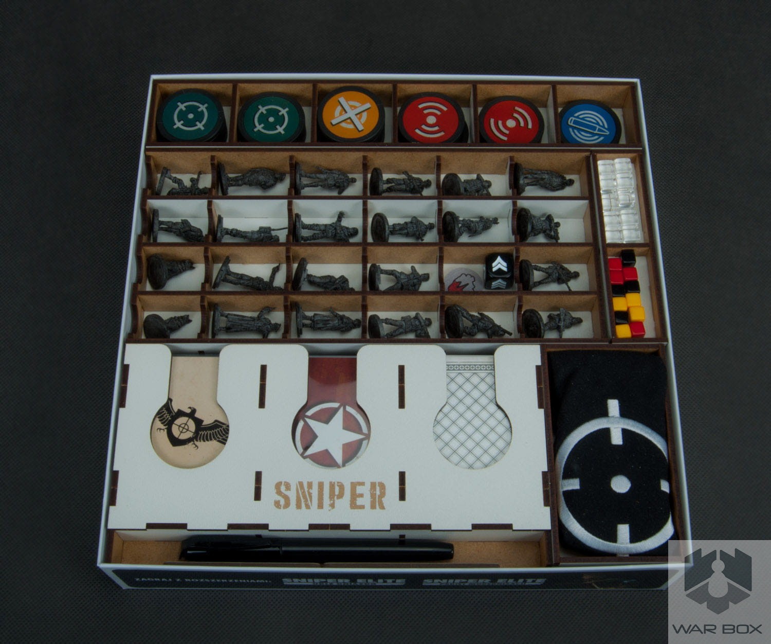 Organizer do gry planszowej Sniper Elite wraz z dodatkami Orle Gniazdo i Pakiet Modernizacji, pozwala kompaktowo przechowywać grę w jednym miejscu zmniejszając ilość pudełek z trzech do jednego. Pomalowane figurki będą bezpieczne dzięki wydzieleniu odrębnej przestrzeni dla każdej z nich. Podajnik na karty pomieści karty w koszulkach do 90 mikronów - na zdjęciu widać koszulki Rebel Premium CCG.