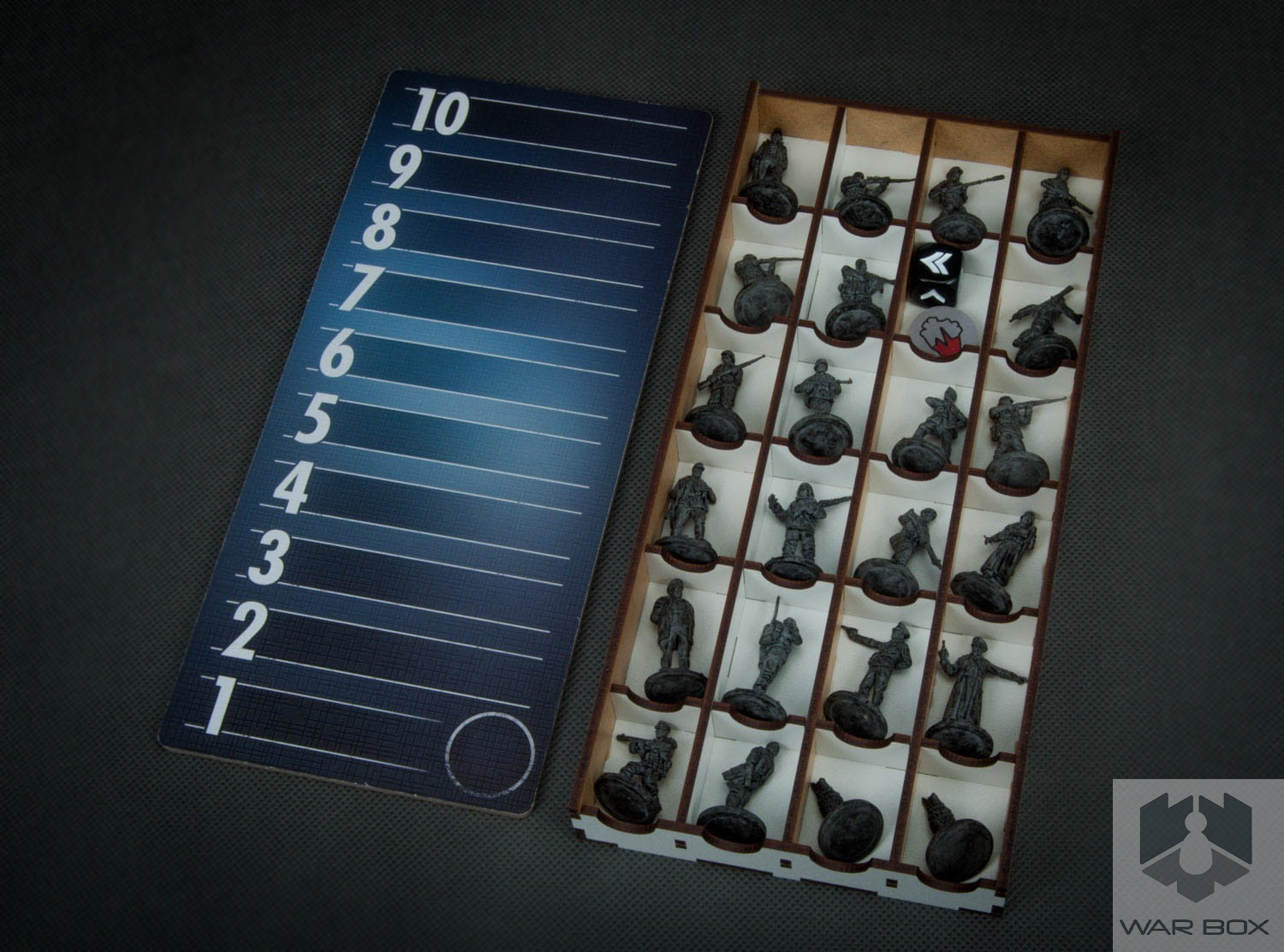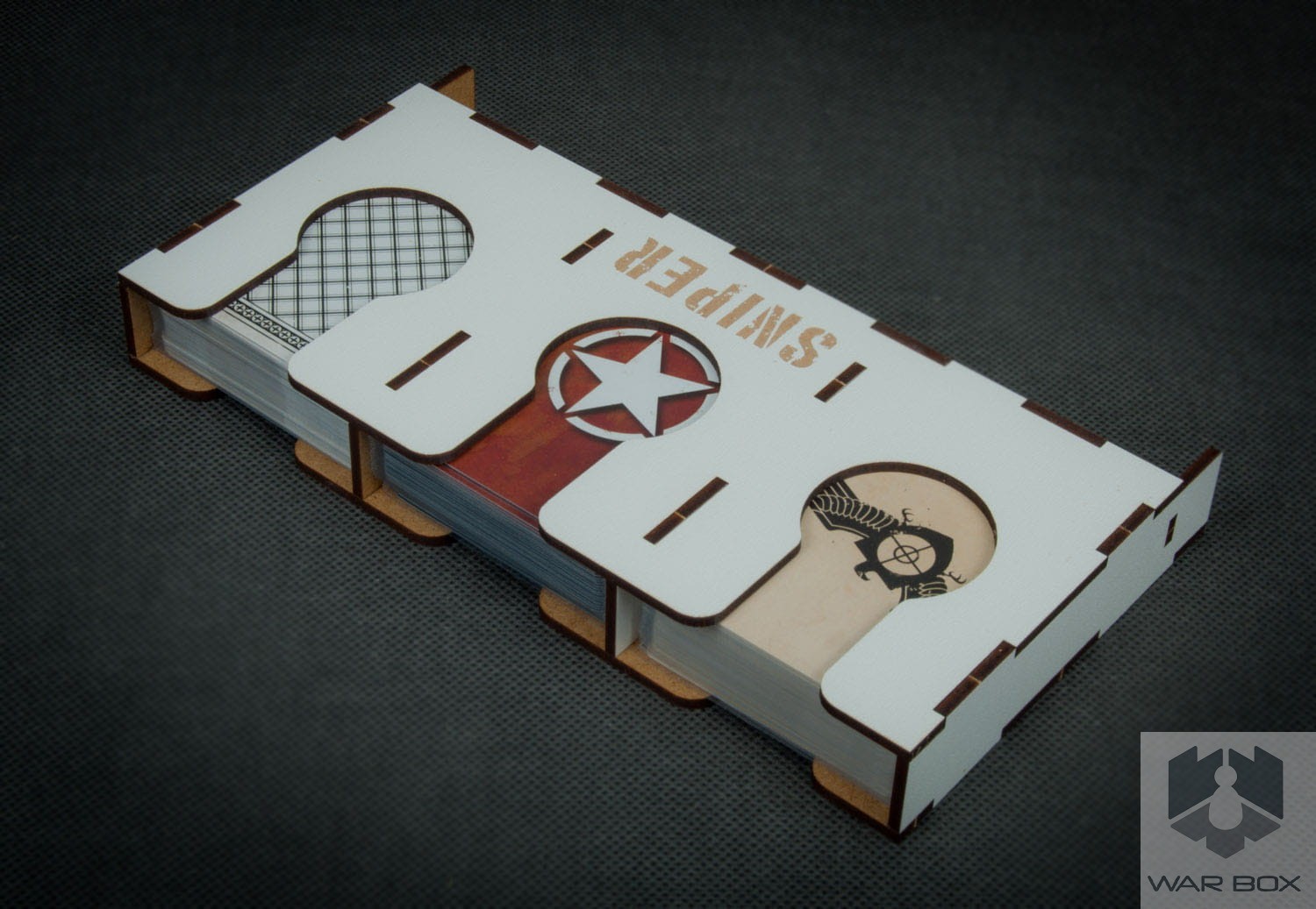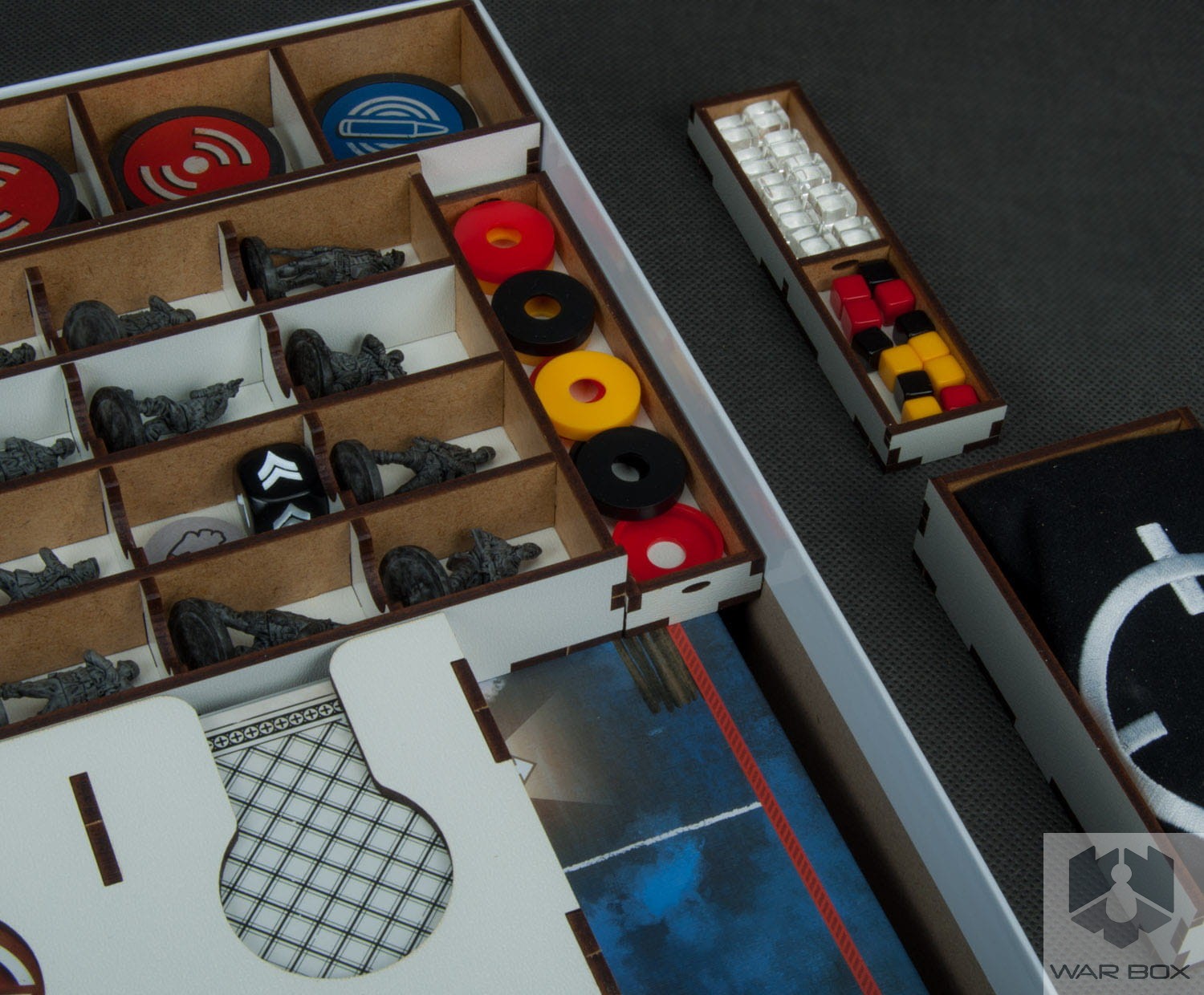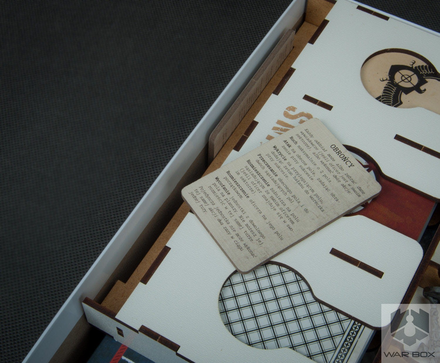 Organizer do gry planszowej Sniper Elite wraz z dodatkami Orle Gniazdo i Pakiet Modernizacji, pozwala kompaktowo przechowywać grę w jednym miejscu zmniejszając ilość pudełek z trzech do jednego. Pomalowane figurki będą bezpieczne dzięki wydzieleniu odrębnej przestrzeni dla każdej z nich. Podajnik na karty pomieści karty w koszulkach do 90 mikronów - na zdjęciu widać koszulki Rebel Premium CCG.