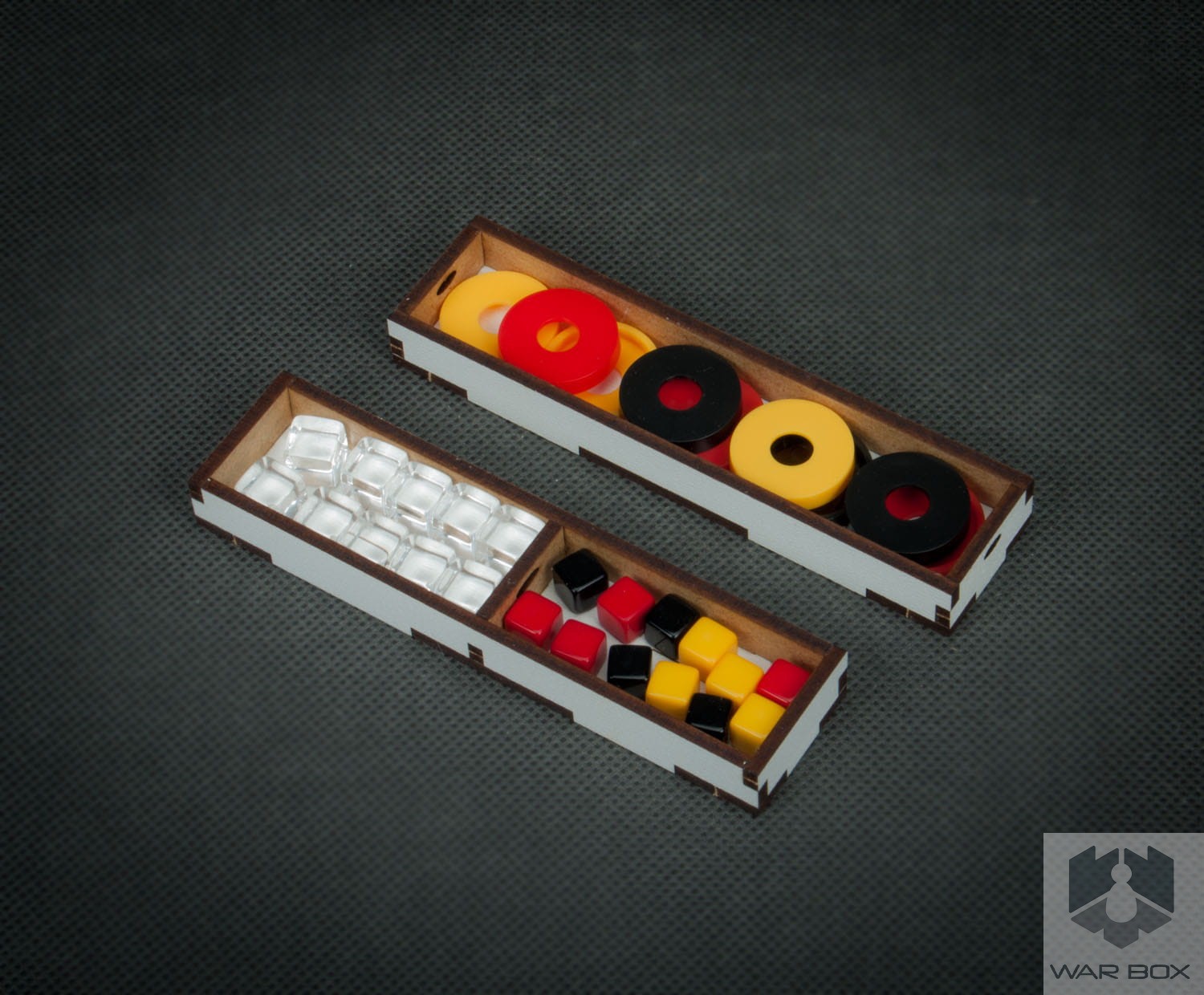 Cała zawartość wraz z planszami z gry podstawowej oraz dodatku mieści się całkowicie w jednym pudełku (plansze od dodatku są wymagane by elementy z gry nie wysypywały się w środku gdyż wraz z insertem tworzą ogólne wypełnienie pudełka).