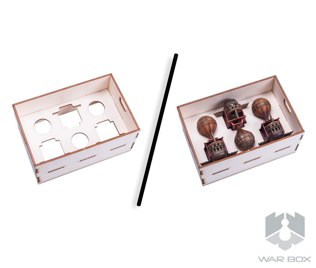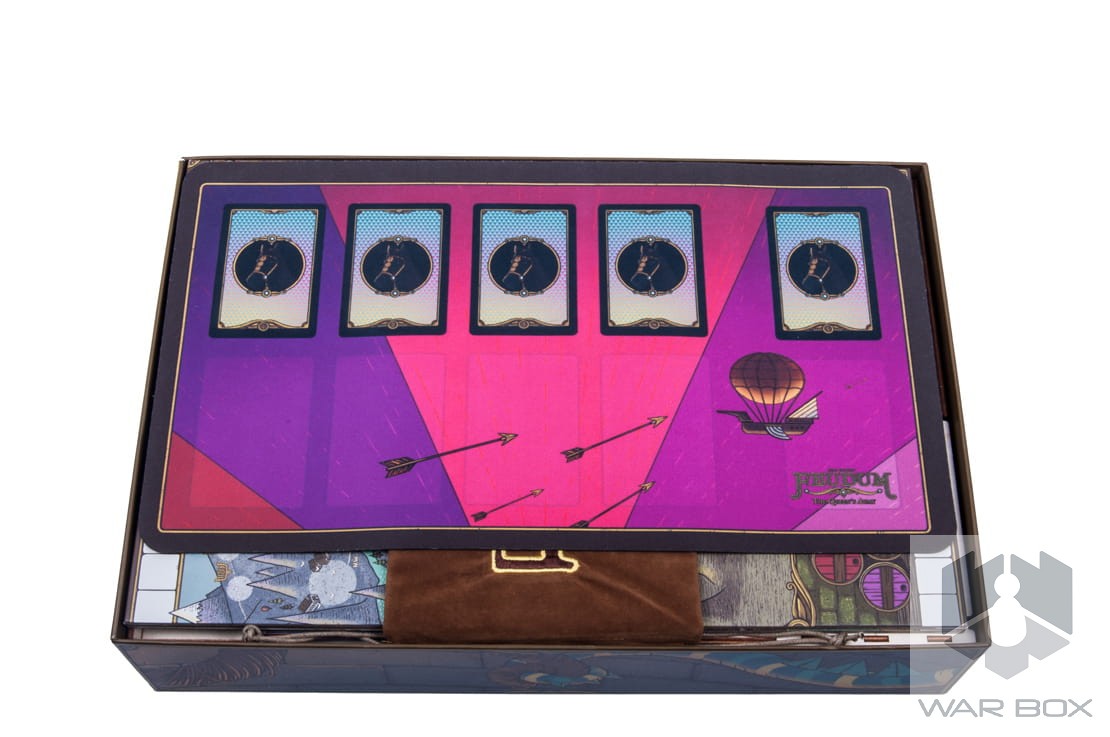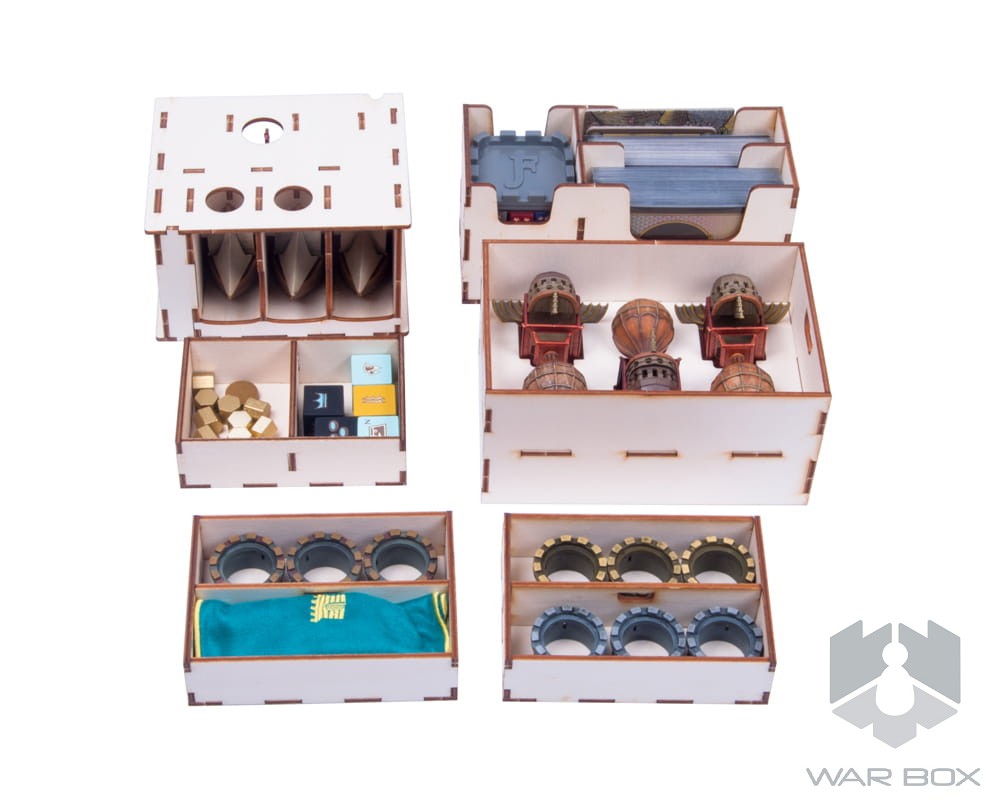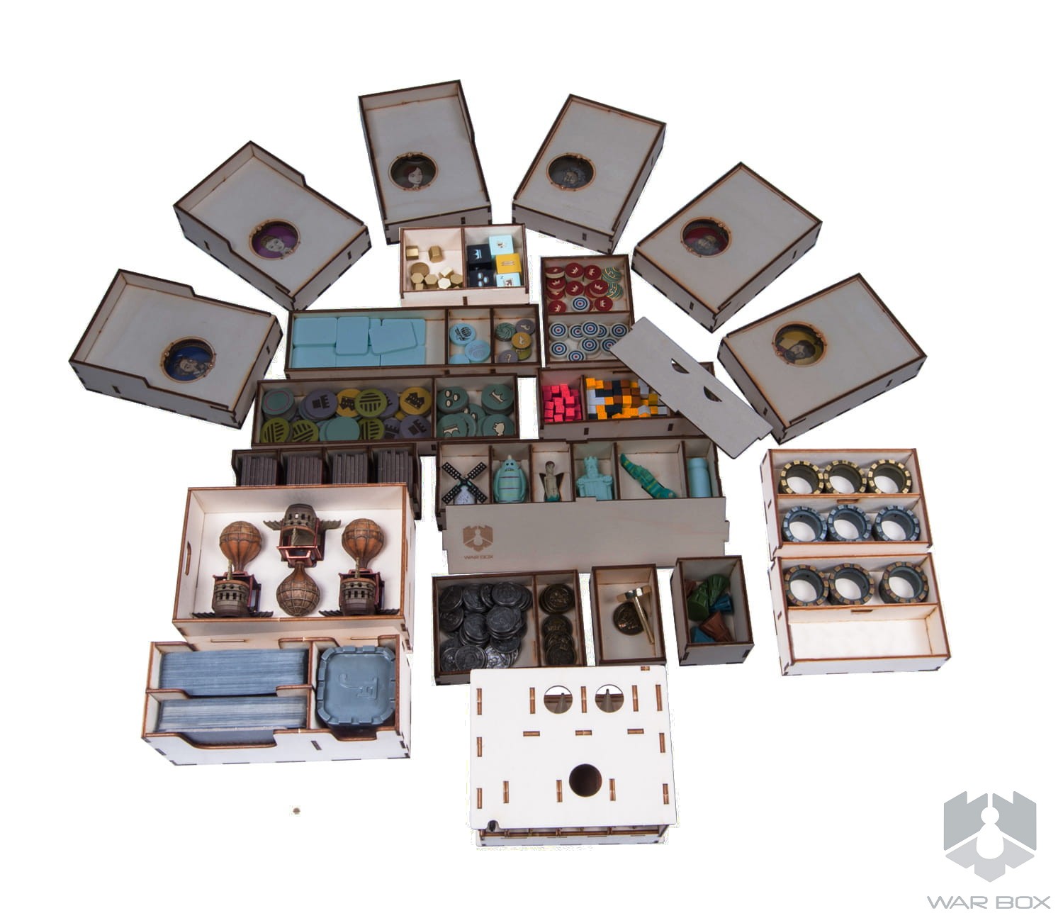 The insert can accommodate not only the base game but also such expansions as: Squirrels & Conifers, Alter Ego, Seals & Sirens, The Queen's Army, Windmills & Catapults, Rudders & Ramparts x3, Resin Windmill, GuildTracking Dice, Metal Airship Flight Stand x3, Deluxe Metal Royal Guards,Deluxe Wooden Pieces (29 pcs), Flying Epoch Marker in Foil, RoyalStarting Player Marker, Embroidered Haversack, Foil-Stamped Wooden Vessels (9 of them), Gilded Progress Die and promo cards.