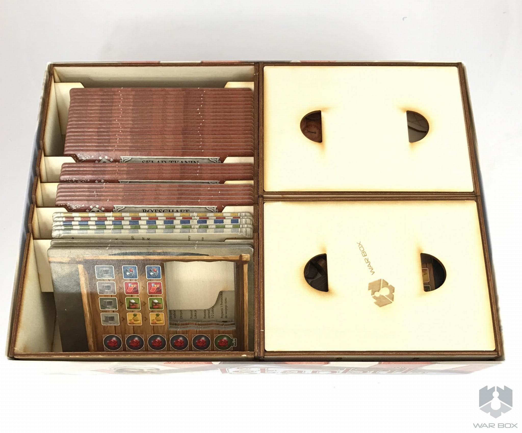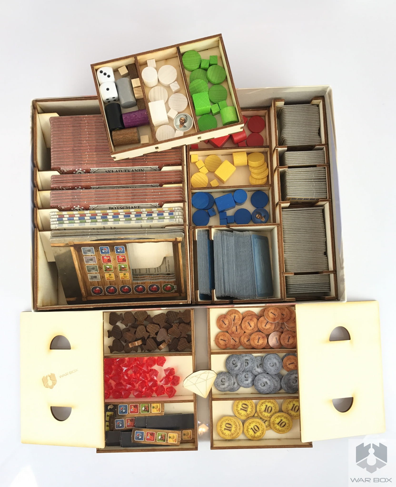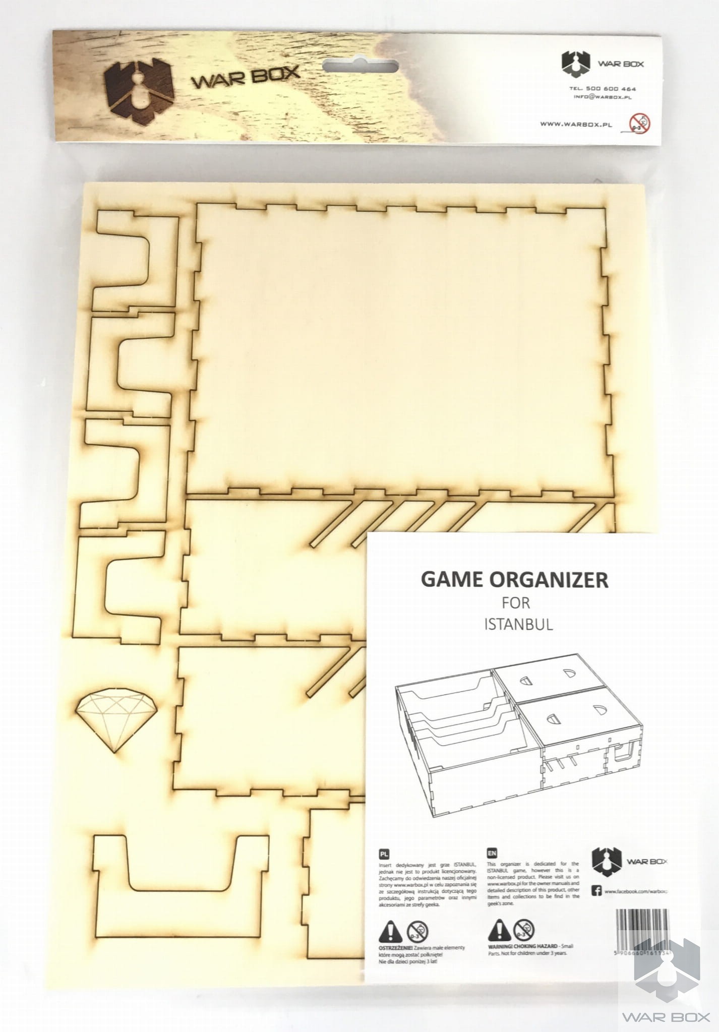 A wooden game organizer for Istanbul. It can store all game elements from core box and two already released expansions ("Mocha & Baksheesh" and "Letters & Seals"). The cards compartment supports sleeved cards and is equipped with adjustable dividers. The token boxes help in keep the game clean and tidy and speed up the setup. Additionally there is a first player marker in the form of wooden ruby.