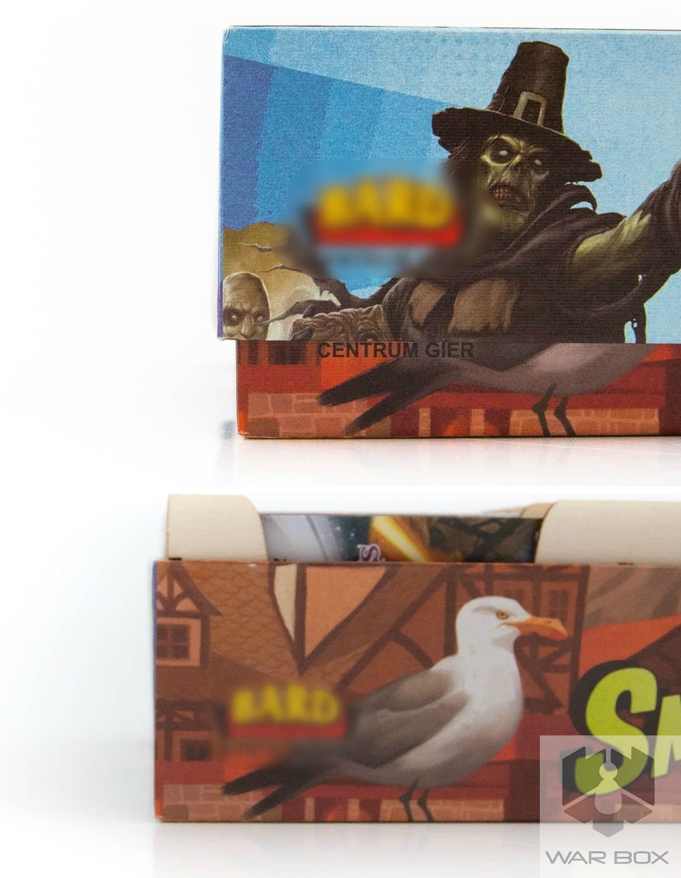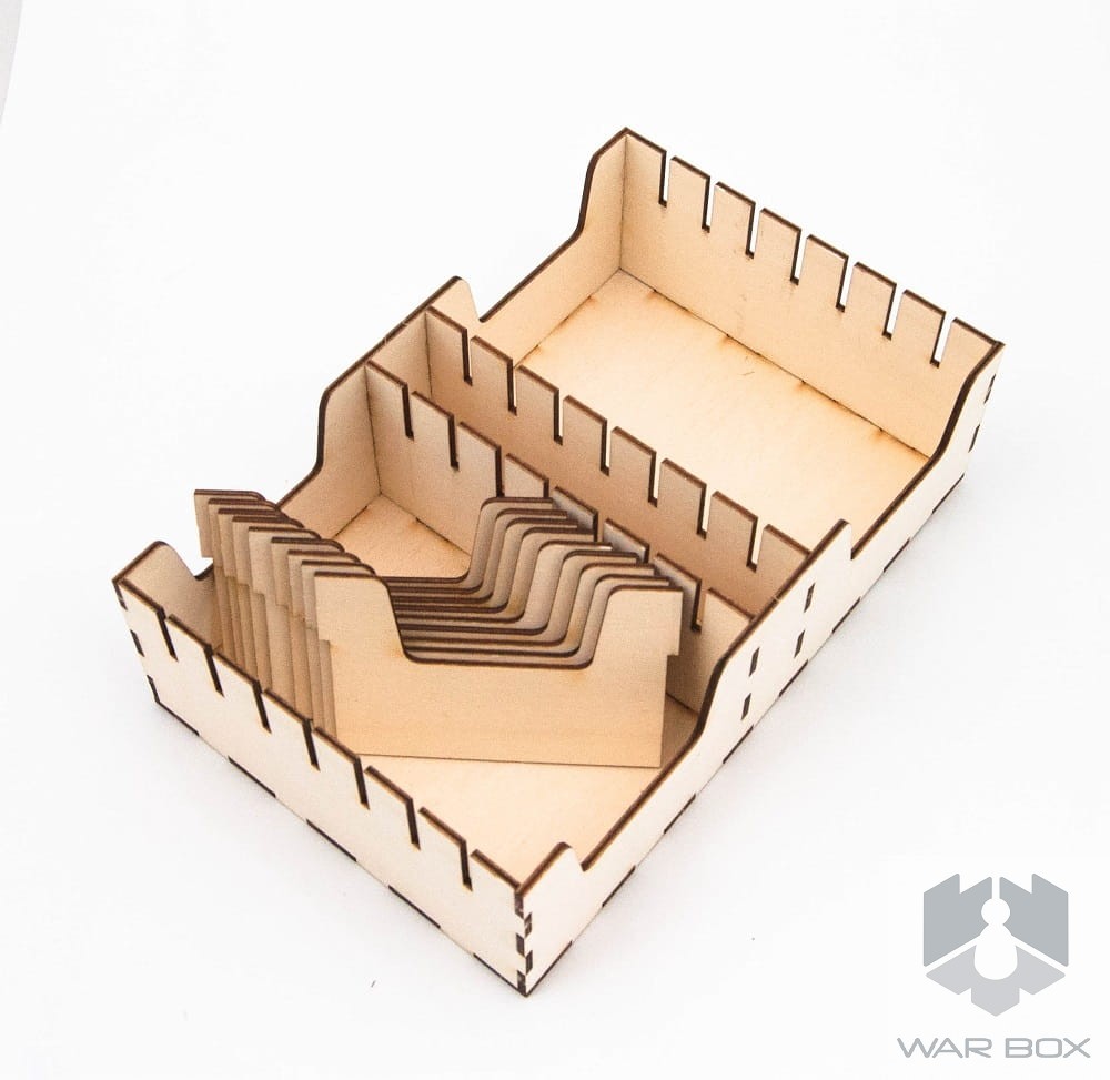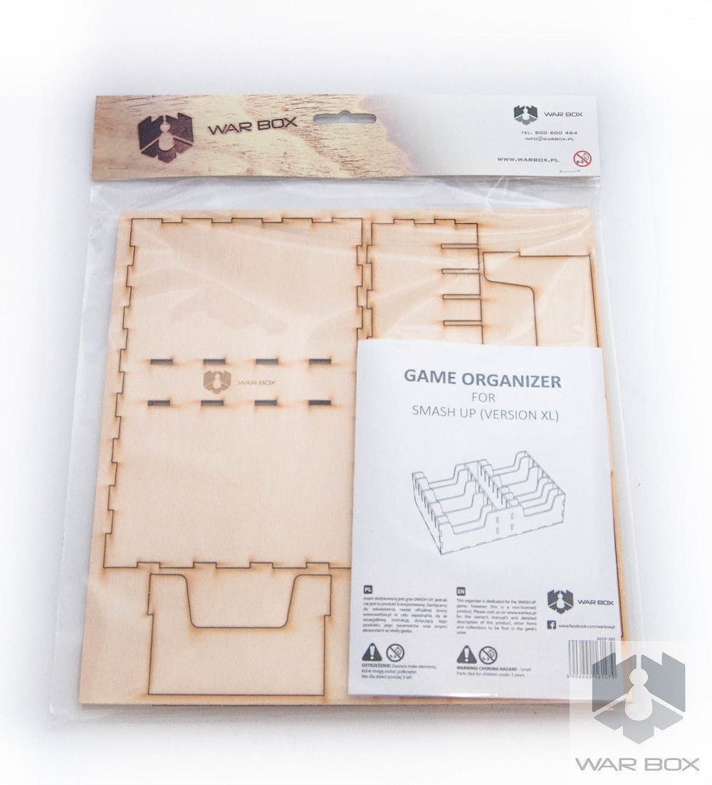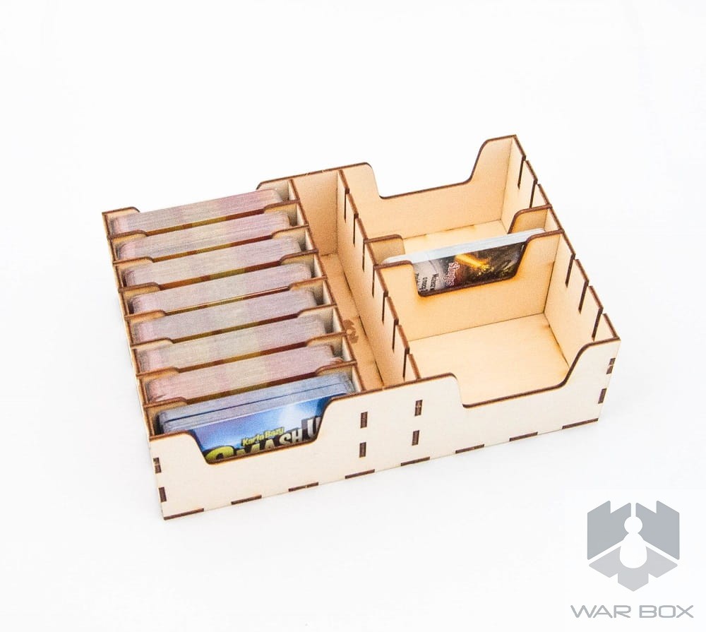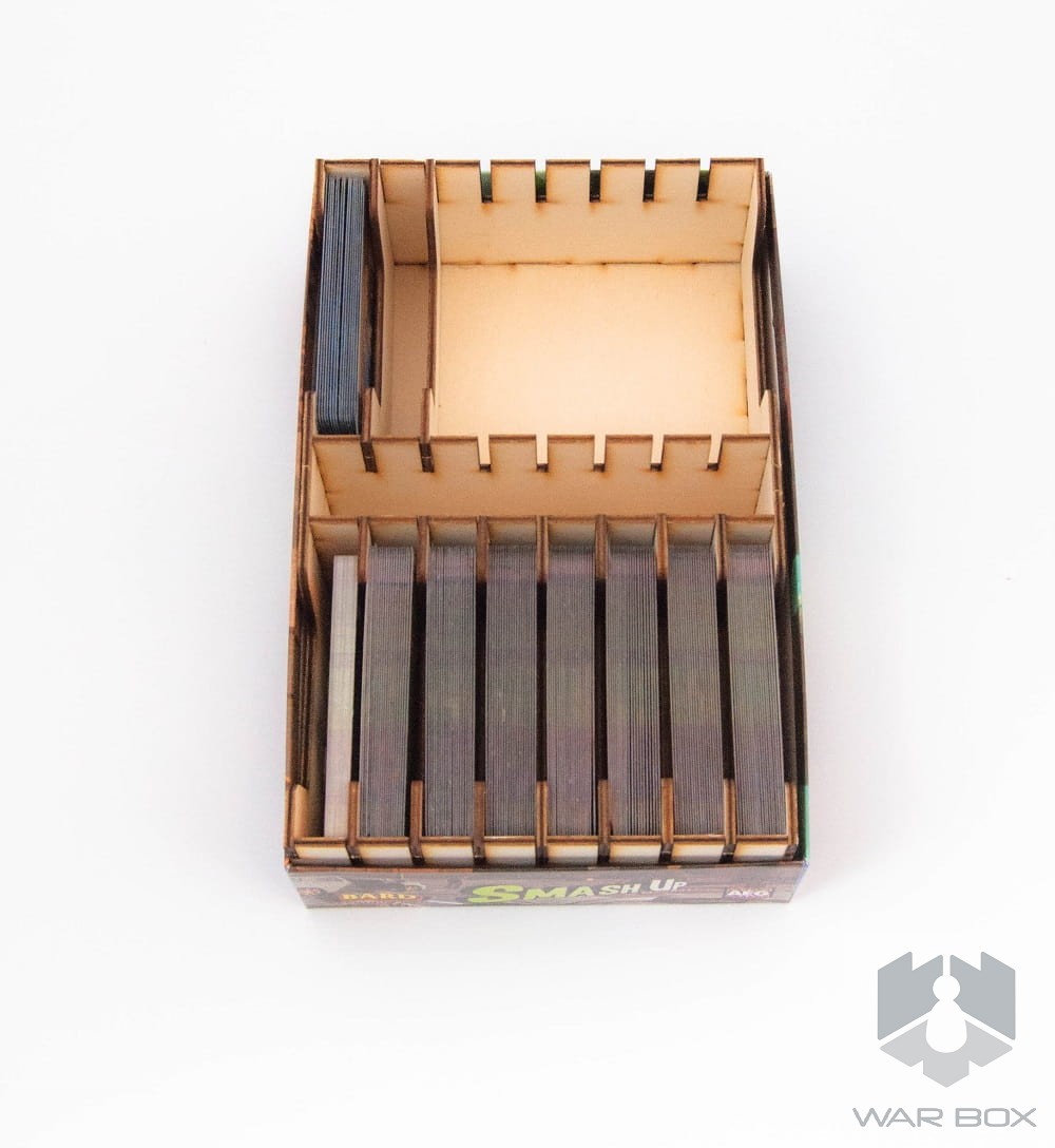 A wooden game organizer for Smash UP - XL version. Our product can store 16 sleeved decks, all separated with dividers (9 in package, but you can buy additional 5 pcs HERE). Becasue of elevated insert, the box cover is a bit above the bottom of the box. It doesn't disturb in usage and storage of the game.