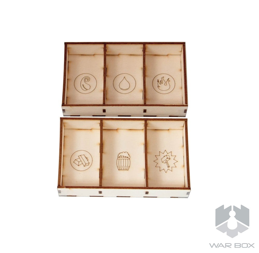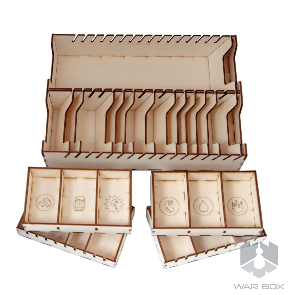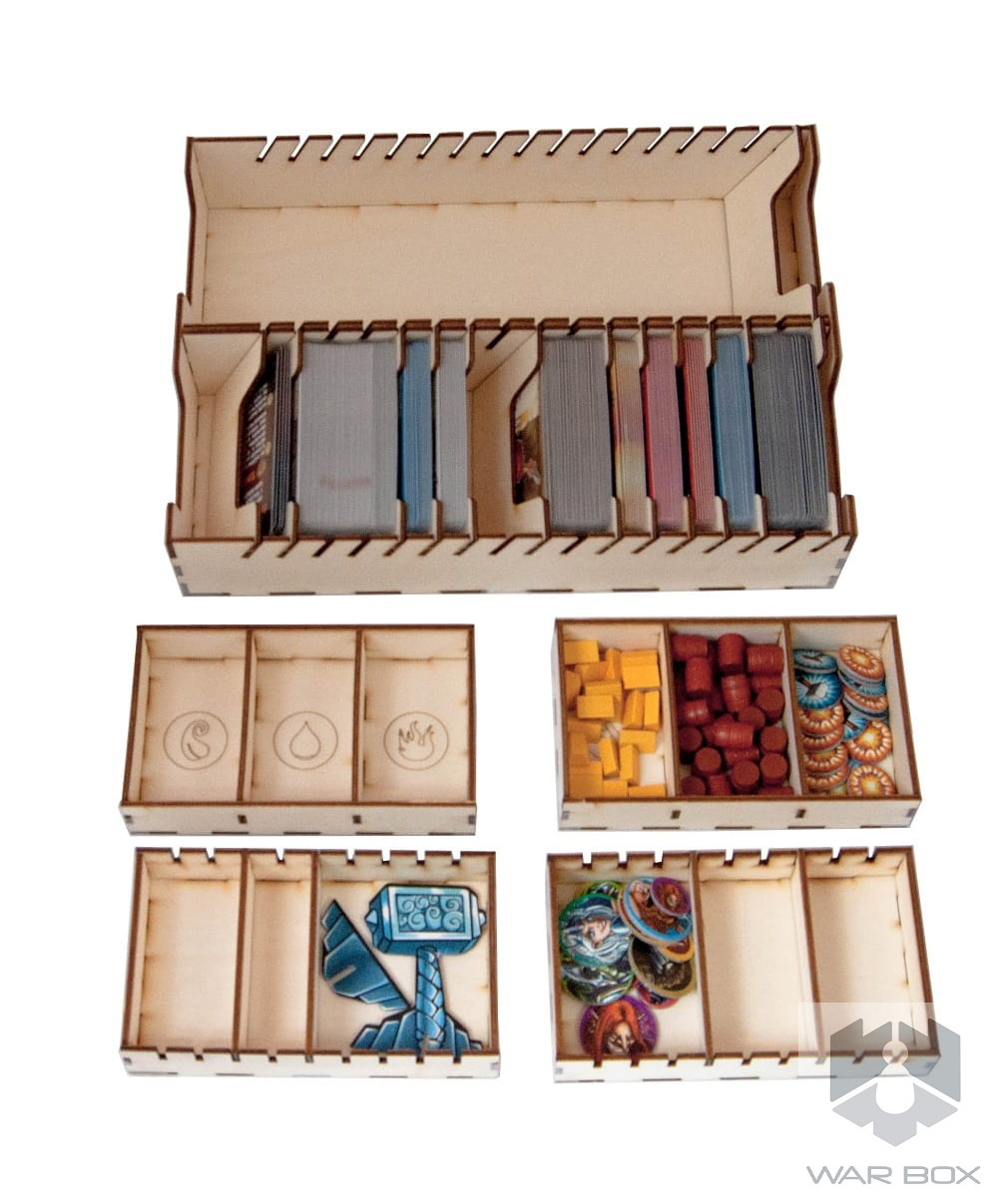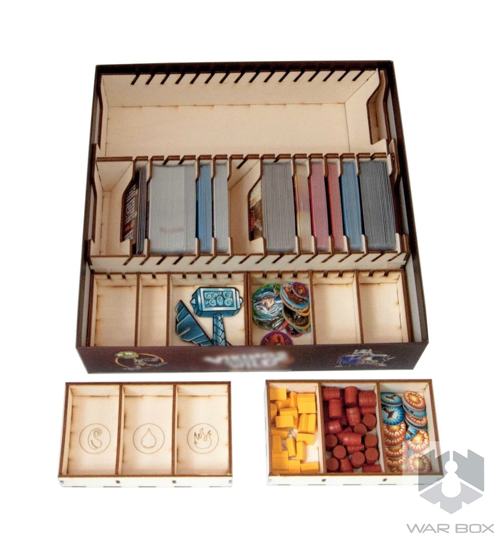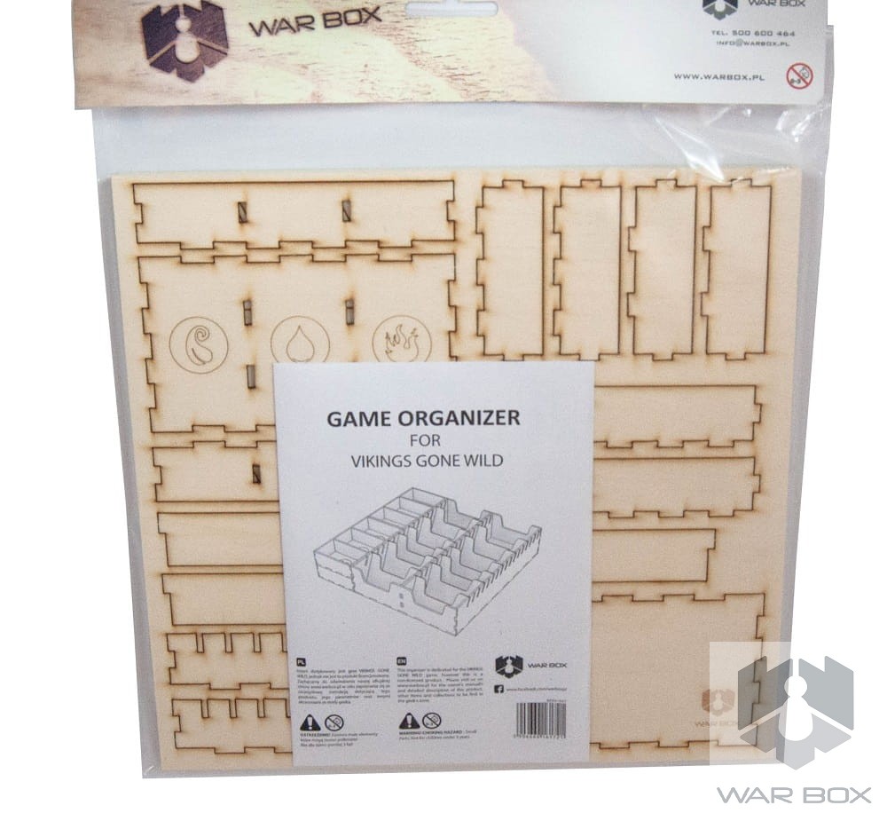 Wooden insert that fits into the Vikings Gone Wild game (not a licensed product). The organizer will accommodate the core game and also has space for following expansions: Masters of Elements, Ragnarok, Guild Wars, It's a Kind of Magic and the 5th Viking.