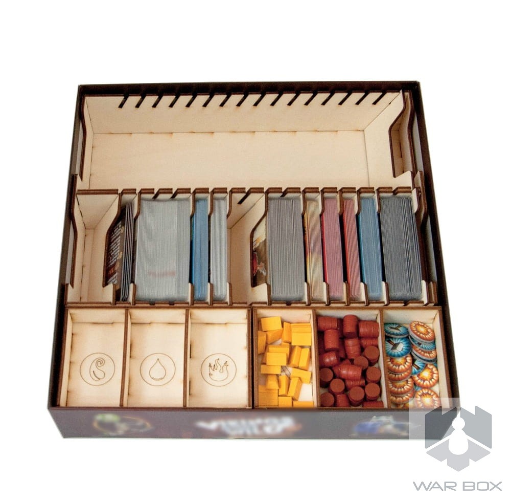 The organizer can store around 550 cards in thick sleeves, and around 750 cards in thin sleeves. The set also includes 4 containers for tokens. Two of them have a separate space for tokens from the core game and element tokens from the Masters of Elements expansion. The other two containers have modular compartments, which everyone can adapt to their own needs.