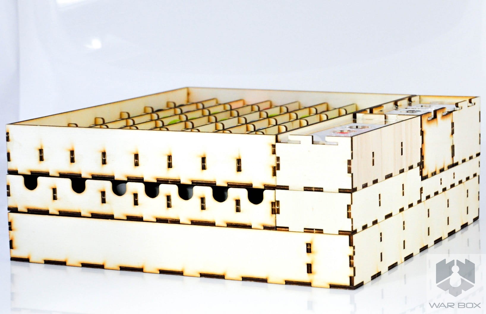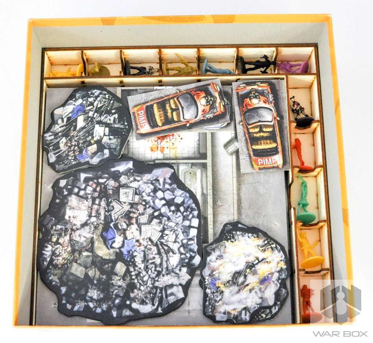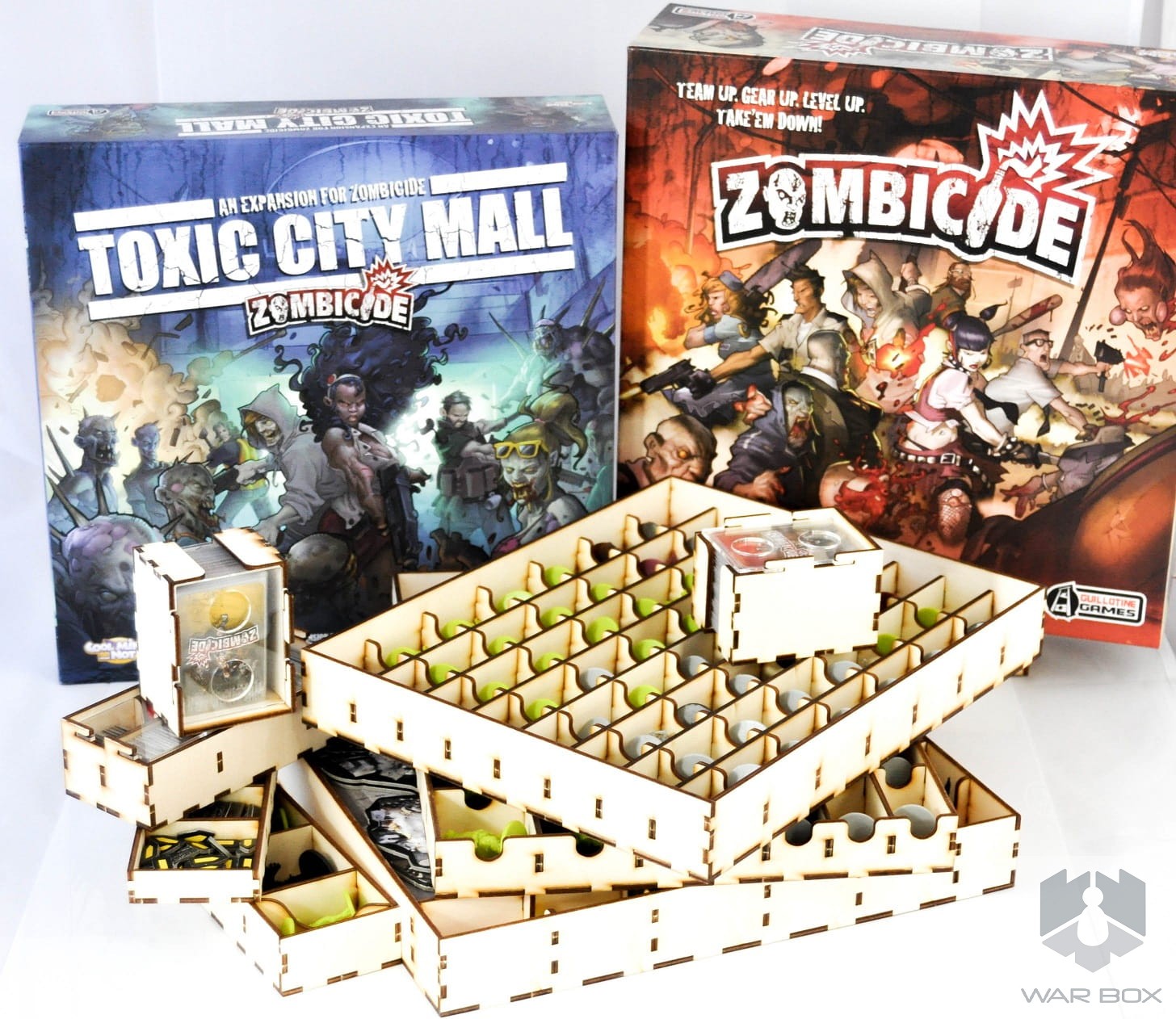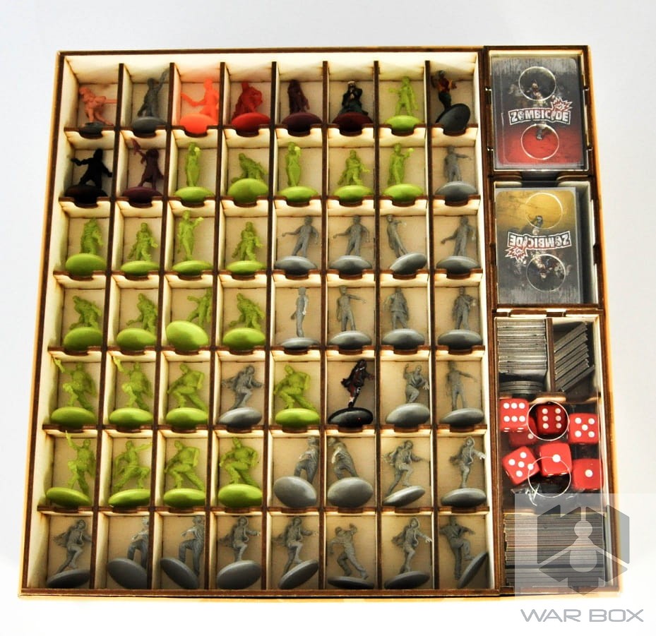 A wooden game organizer for Zombicide with Toxic City Mall expansion. It is designed in order to fit the contents of two game boxes in one, what makes the game setup easier and faster. In addition, as a part of set you get two deck holders (sleeved cards fit in). Take care of your miniatures and store them safely.