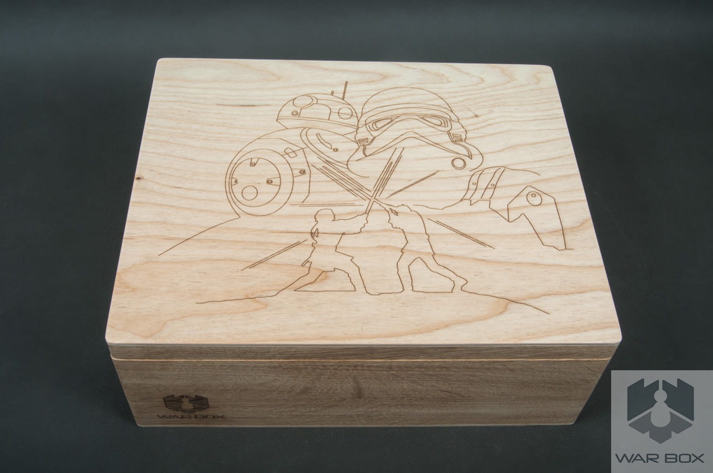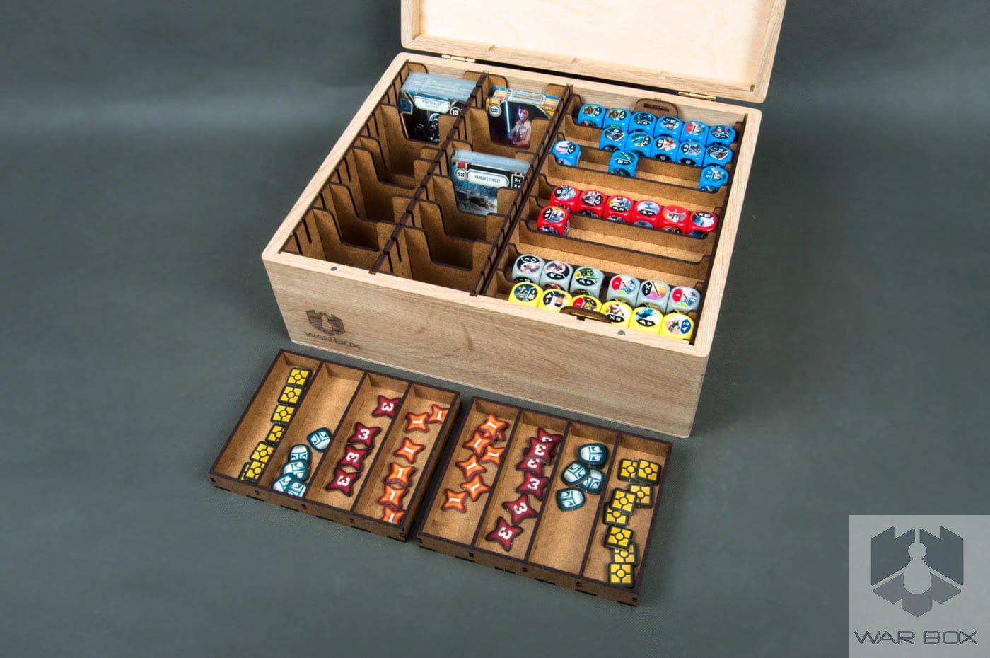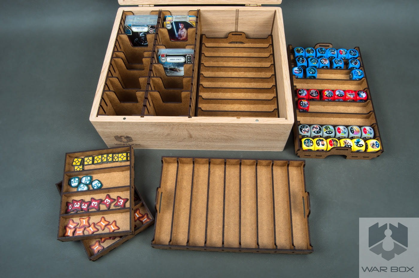 Dębowy, kolekcjonerski kufer dedykowany grze Star Wars Przeznaczenie. Produkt pomieści się ok 1300 kart bez koszulek oraz ok 700 kart w grubych koszulkach, jedna komora na karty ma 240 mm długości). Dodatkowo skrzynia została zaopatrzona w 3 pojemniki na kostki gdzie w sumie zmieścimy ich 162 sztuki. Do pozostałych dwóch pojemniczków możemy schować żetony, po zestawie dla oby graczy.