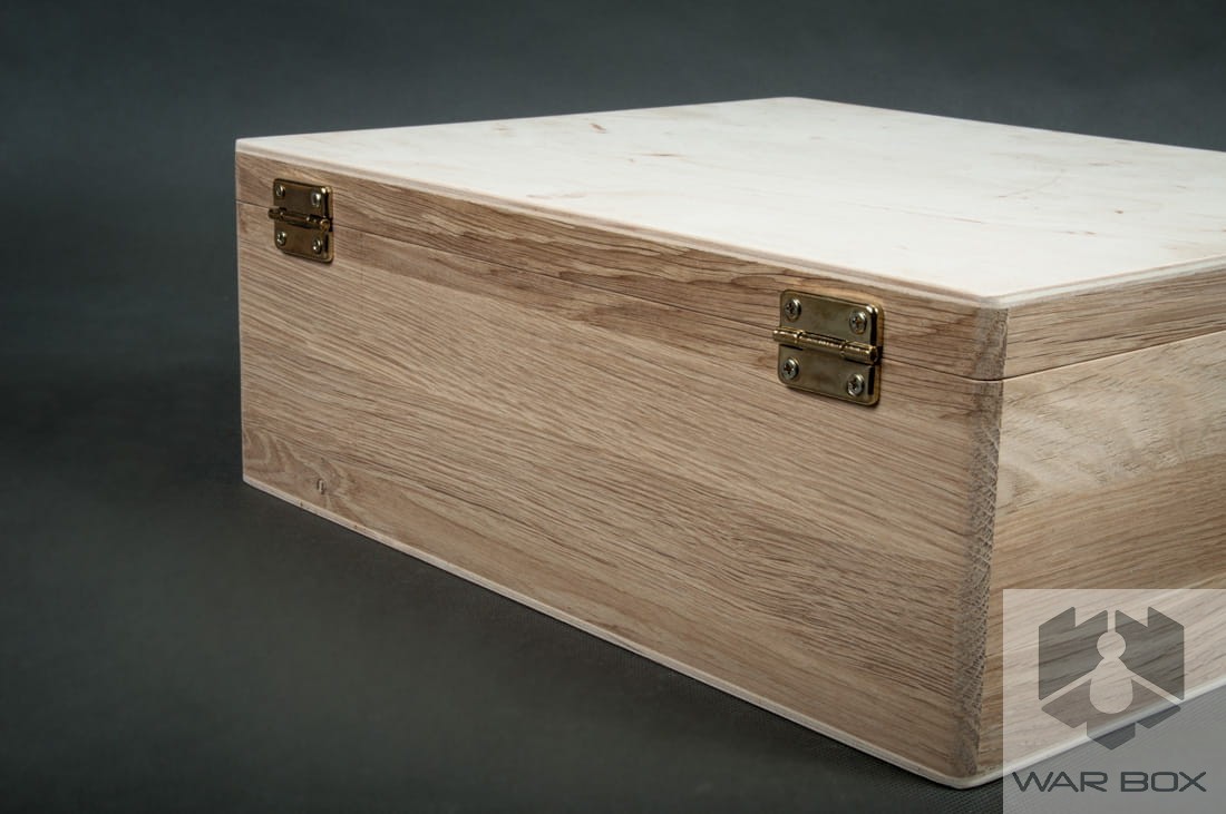 Kufer wykonany jest z drewna dębowego (wieko oraz spód zostały wykonane ze sklejki brzozowej) i świetnie nadaje się do ewentualnego olejowania, bejcowania czy lakierowania.