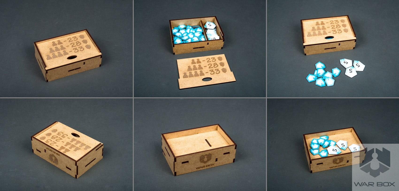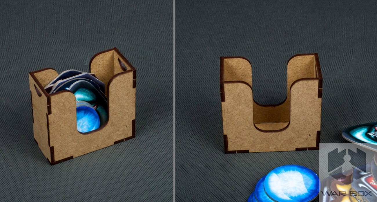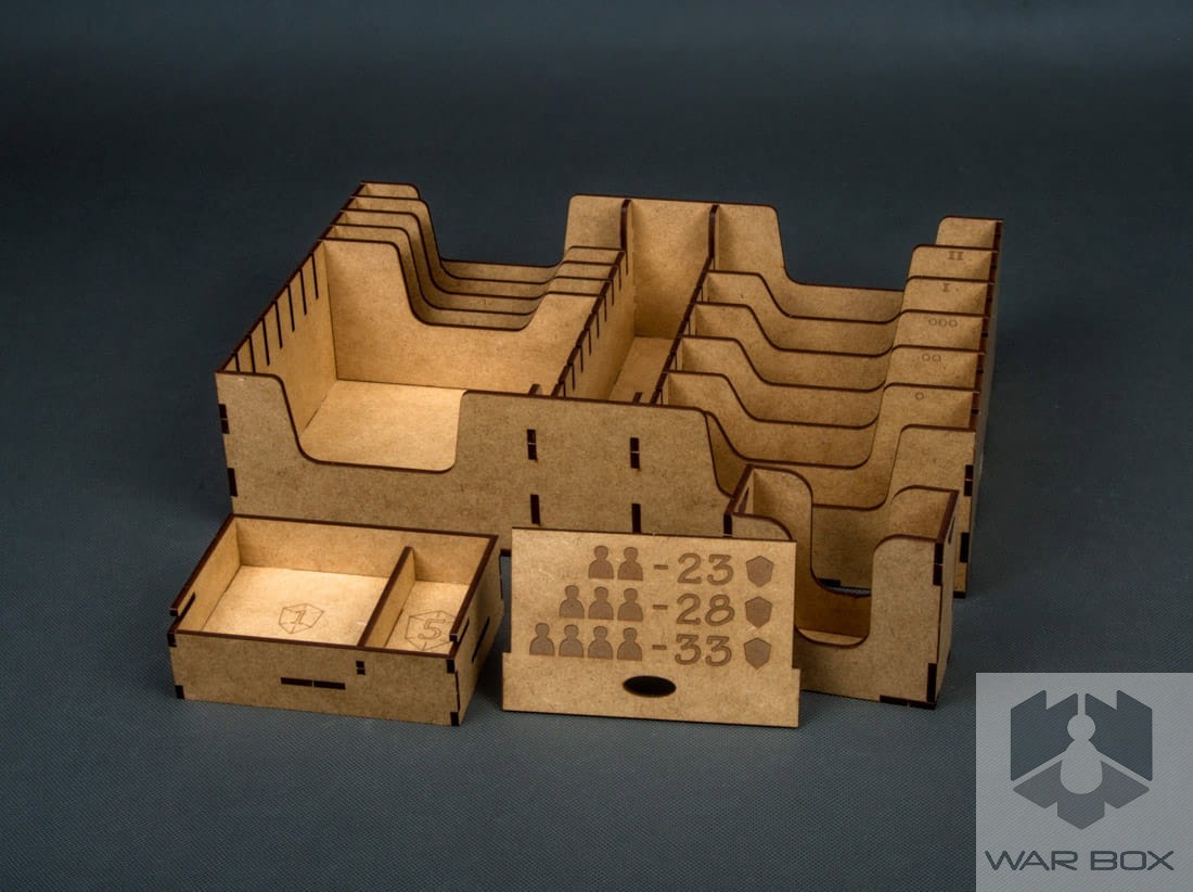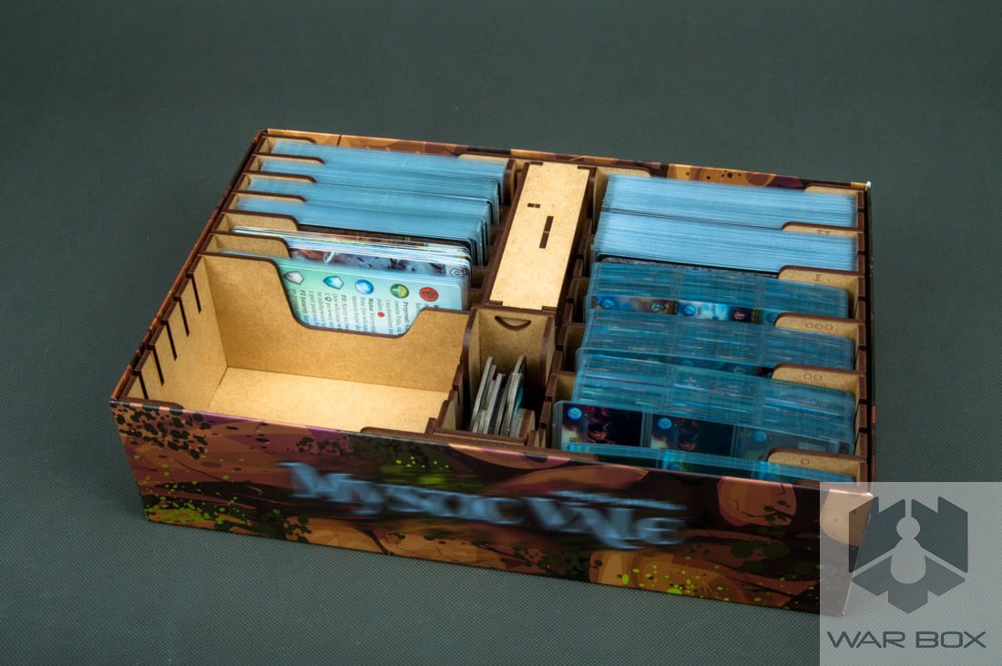 Organizer ten dedykowany jest grze Mystic Vale edycja BIG BOX którą zawiera grę podstawową oraz dodatki Dolina Magii, Dolina Dziczy i Burza Many. Produkt posiada przegródki z ikonami typu talii, ułatwiając sortowanie kart. Dwustronny pojemnik na żetony, z którego dzięki instrukcji wygrawerowanej na klapce szybko przygotujemy wymaganą ilość punktów zgodnie z ilością graczy, aby następnie umieścić je z drugiej strony pudełka i korzystać z nich w czasie gry. W insercie jest jeszcze sporo miejsca na kolejne dodatki.