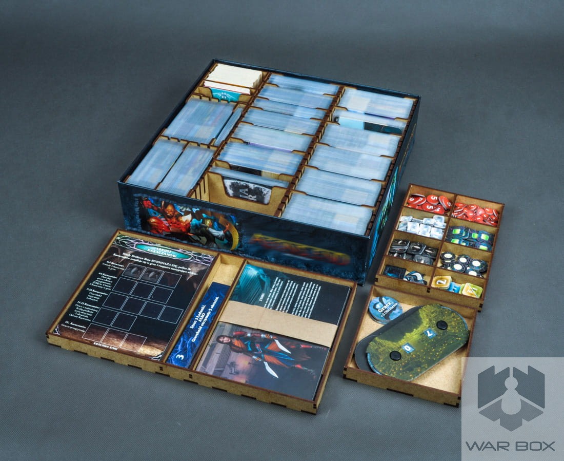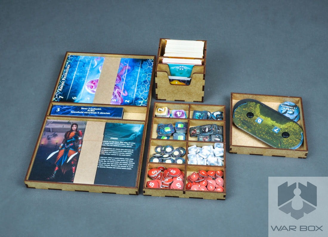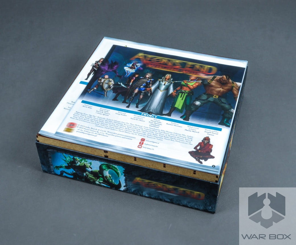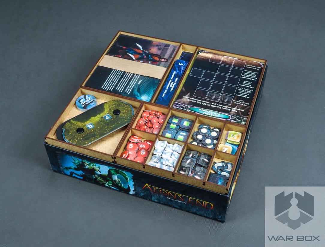 Drewniany insert pasujący do gry Aeon's End (edycja polska) w wersji XL. Organizer zaprojektowany tak, aby zmieścić jak najwięcej kart na pierwszym poziomie oraz pozostałe komponenty na jego podwyższeniu względem klasycznego insertu.
