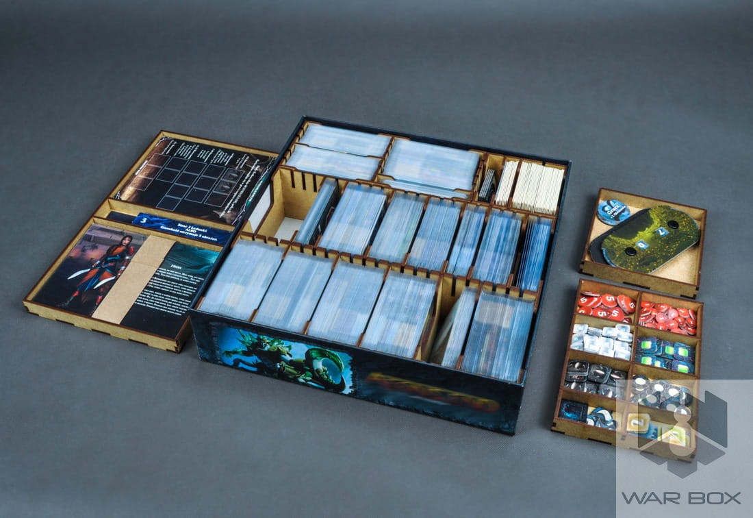 Wieko pudełka odstaje ok 17mm co można zaobserwować na jednym ze zdjęć . W insercie jest miejsce na 1 komplet liczników życia (tylko jeden zestaw jest wykorzystywany do gry, nawet w przypadku posiadania obu części gry podstawowej).